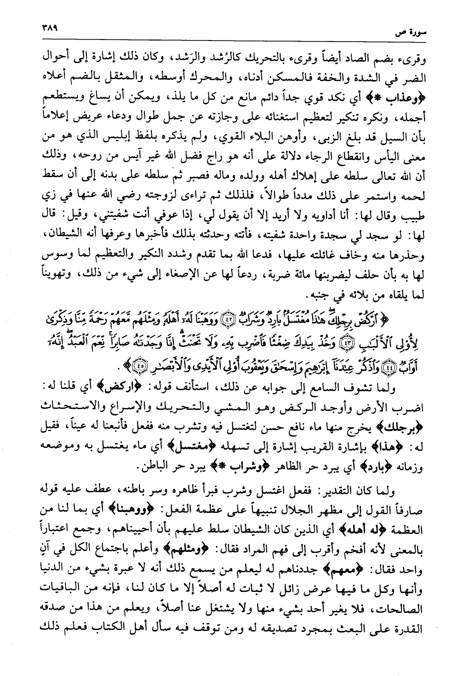 ) ارْكُضْ بِرِجْلِكَ هَذَا مُغْتَسَلٌ بَارِدٌ وَشَرَابٌ وَوَهَبْنَا لَهُ أَهْلَهُ وَمِثْلَهُمْ مَّعَهُمْ رَحْمَةً مِّنَّا وَذِكْرَى لأُوْلِي الأَلْبَابِ وَخُذْ بِيَدِكَ ضِغْثاً فَاضْرِب بِّهِ وَلاَ تَحْنَثْ إِنَّا وَجَدْنَاهُ صَابِراً نِّعْمَ الْعَبْدُ إِنَّهُ أَوَّابٌ وَاذْكُرْ عِبَادَنَآ إِبْرَاهِيمَ وَإِسْحَاقَ وَيَعْقُوبَ أُوْلِي الأَيْدِي وَالأَبْصَارِ ( ( )
