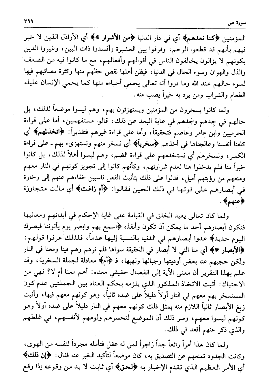 ف ) أم ( معادلة لجملة السخرية ، وقد علم بهاذ التقدير أن معنى الآية إلى إنفصال حقيقي معناه : أهم معنا أم لا ؟ فهي من الاحتباك : أثبت الاتخاذ المذكور الذي يلزمه بحكم العناد بين الجملتين عدم كون المستسخر بهم معهم في النار اولاً دليلاً على ضده ثانياً ، وهو كونهم معهم فيها ، وأثبت زيغ الأبصار ثانياً اللازم منه بمثل ذلك كونهم معهم في النار دليلاً على ضده أولاً وهو كونهم ليسوا معهم ، وسر ذلك أن الموضع لتسحرهم ولومهم لأنفسهم ، في غلطهم والذي ذكر عنهم أقعد في ذلك .