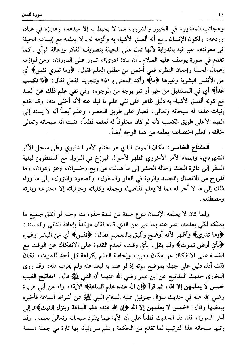 وعجائب المقدور ، في الخيور والشرور ، مما لا يحيط به إلا مبدعه ، وغارزه في عباده وودعه ، ولكون الإنسان - مع أنه ألصق الأشياء وألزمه له - لا يعلمه مع إيساعه الحيلة في معرفته ، عبر فيه بالدراية لأنها تدل على الحيلة بتصريف الفكر وإجالة الرأي - كما تقدم في سورة يوسف عليه السلام - أن مادة ( درى ) تدور على الدوران ، ومن لوازمه إعمال الحيلة وإمعان النظر ، فهي أخص من مطلق العلم فقال : ( وما تدري نفس ) أي من الأنفس البشرية وغيرها ) ما ( وأكد المعنى ب ( ذا ) وتجريد الفعل فقال : ( ذا تكسب غداً ) أي في المستقبل من خير أو شر بوجه من الوجوه ، وفي نفي علم ذلك من العبد مع كونه ألصق الأشياء به دليل ظاهر على نفي علم ما قبله عنه لأنه أخفى منه ، وقد تقدم إثبات علمه له سبحانه وتعالى ، فصار على طريق الحصر ، وعلم أيضاً أنه لا يسند إلى العبد الأعلى طريق الكسب لأنه لو كان مخلوقاً له لعلمه قطعاً ، فثبت أنه سبحانه وتعالى خالقه ، فعلم اختصاصه بعلمه من هذا الوجه أيضاً .