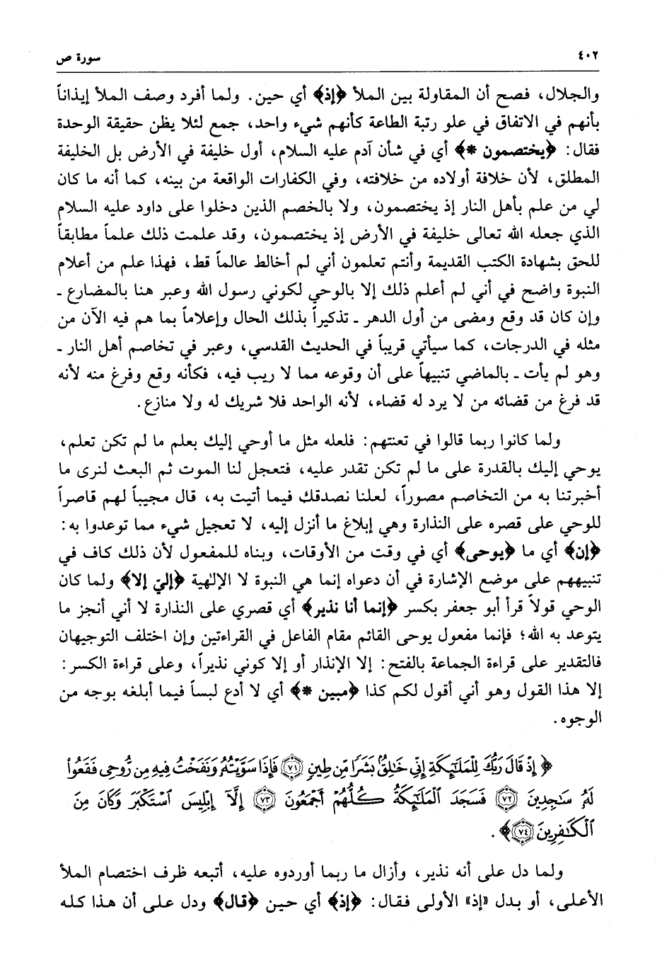 ) إِذْ قَالَ رَبُّكَ لِلْمَلاَئِكَةِ إِنِّي خَالِقٌ بَشَراً مِّن طِينٍ فَإِذَا سَوَّيْتُهُ وَنَفَخْتُ فِيهِ مِن رُّوحِي فَقَعُواْ لَهُ سَاجِدِينَ فَسَجَدَ الْمَلاَئِكَةُ كُلُّهُمْ أَجْمَعُونَ إِلاَّ إِبْلِيسَ اسْتَكْبَرَ وَكَانَ مِنَ الْكَافِرِينَ ( ( )