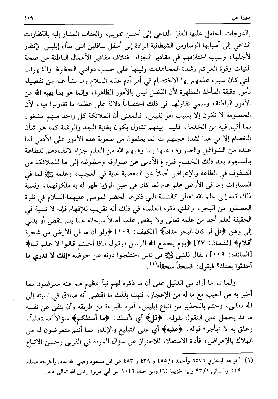 بالدرجات الحامل عليها العقل الداعي إلى أحسن تقويم ، والعقاب المشار إليه بالكفارات الداعي إلى أسبابها الوساس الشيطانية الرادة إلى أسفل سافلين التي سأل إبليس الإنظار لأجلها ، وسبب اختلافهم في مقادير الجزاء اختلاف مقادير الأعمال الباطنة من صحة النيات وقة العزائم وشدة المجاهدات ولينها على حسب دواعي الحظوظ والشهوات التي كان سبب علمهم بهذا الاختصام في أمر آدم عليه السلام وما نشأ عنه تفصيله بأمور دقيقة المأخذ المظهرة لأن الفضل في ذلك اختصاماً دلالة على عظمة ما تقاولوا فيه ، لأن الخصومة لا تكون إلا بسبب أمر نفيس ، فالمعنى أن الملائكة كل واحد منهم مشغول بما أقيم فيه من الخدمة ، فليس بينهم تقاول يكون بغاية بغاية الجد والرغبة كما هو شأن الخصام إلا في هذا لشدة عجبهم منه لما يعملون من صعوبة هذه الأمور على الآدمي لما عنده من الشواغل والصوارف عنها بما وهبهم الله من العلم جزاء لانقيادهم للطاعة بالسجود بعد ذلك الخصام فنزوع الآدمي عن صوارفه وحظوظه إلى ما للملائكة من الصفوف في الطاعة والإعراض أصلاً عن المعصية غاية في العجب ، وعلمه ( صلى الله عليه وسلم ) لما في السماوات وما في الأرض علم عام لما كان في حين الرؤيا ظهر له به ملكوتهما ، ونسبة ذلك كله إلى علم الله تعالى كالنسبة التي ذكرها الخضر لموسى عليهما السلام وفي نفرة العصفور من البحر ، والذي ذكره العلماء في ذلك أنه تقريب للإفهام فإنه لا نسبة في الحقيقة لعلم أحد من علمه تعالى ولا بنقص علمه أصلاً سبحانه عما يلم بنقص أو يدني إلى وهن