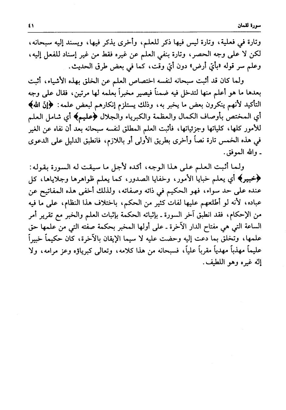 ولما أثبت العلم على هذا الوجه ، أكده لأجل ما سقيت له السورة بقوله : ( خبير ) أي يعلم خبايا الأمور ، وخفايا الصدور ، كما يعلم ظواهرها وجلاياها ، كل عنده على حد سواء ، فهو الحكيم في ذاته وصفاته ، ولذلك أخفى هذه المفاتيح عن عباده ، لأنه لو أطلعهم عليها لفات كثير من الحم ، باختلاف هذا النظام ، على ما فيه من الإحكام ، فقد انطبق آخر السورة - بإثباته الحكمة بإثبات العلم والخبر مع تقرير أمر الساعة التي هي مفتاح الدار الآخرة - على أولها المخبر بحكمة صفته التي من علمها حق علمها ، وتخلق بما دعت إليه وحضت عليه لا سيما الإيقان بالآرخة ، كان حكيماً خبيراً عليماً مذهباً مهدياً مقرباً علياً ، فسبحانه من هذا كلامه ، وتعالى كبرياؤه وعز مرامه ، ولا إله غيره وهو اللطيف .