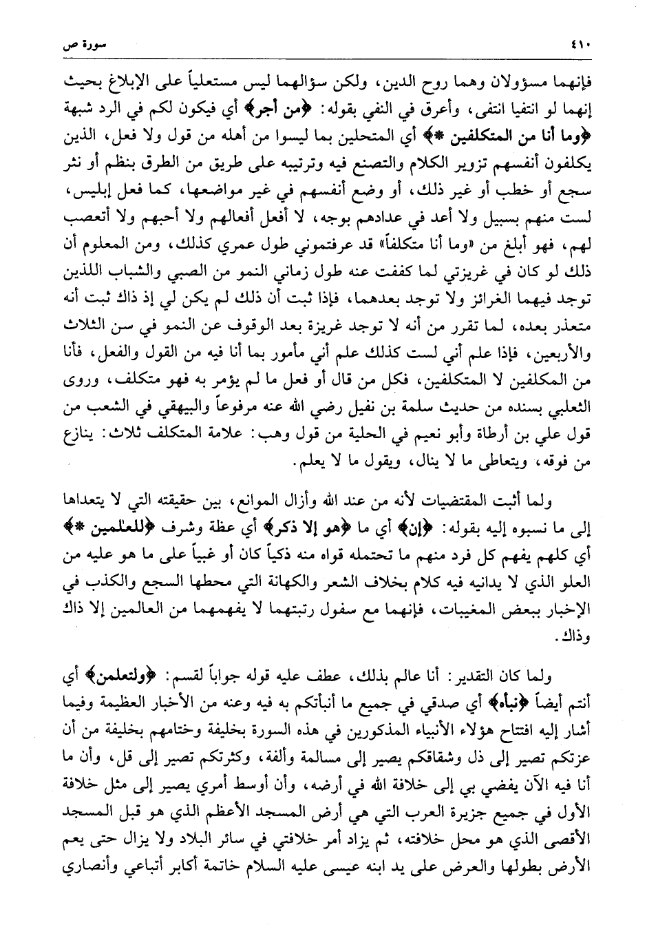 فإنهما مسؤولان وهما روح الدين ، ولكن سؤالهما ليس مستعلياً على الإبلاغ بحيث إنهما لو انتفيا انتفى ، وأعرق في النفي بقوله : ( من أجر ) أي فيكون لكم في الرد شبهة ) وما أنا من المتكلفين ) أي المتحلين بما ليسوا من أهله من قول ولا فعل ، الذين يكلفون أنفسهم تزوير الكلام والتصنع فيه وترتيبه على طريق من الطرق بنظم أو نثر سجع أو خطب أو غير ذلك ، أو وضع أنفسهم في غير مواضعها ، كما فعل إبليس ، لست منهم بسبيل ولا أعد في عدادهم بوجه ، لا أفعل أفعالهم ولا أحبهم ولا أتعصب لهم ، فهو أبلغ من ( وما أنا متكلفاً ) قد عرفتموني طول عمري كذلك ، ومن المعلوم أن ذلك لو كان في غريزتي لما كففت عنه طول زماني النمو من الصبي والشباب اللذين توجد فيهما الغرائز ولا توجد بعدهما ، فإذا ثبت أن ذلك لم يكن لي إذ ذاك ثبت أنه متعذر بعده ، لما تقرر من أنه لا توجد غريزة بعد الوقوف عن النمو في سن الثلاث والأربعين ، فإذا علم أني لست كذلك علم أني مأمور بما أنا فيه من القول والفعل ، فأنا من المكلفين لا المتكلفين ، فكل من قال أو فعل ما لم يؤمر به فهو متكلف ، وروى الثعلبي بسنده من حديث سلمة بن نفيل رضي الله عنه مرفوعاً والبيهقي في الشعب من قول علي بن أرطاة وأبو نعيم في الحلية من قول وهب : علامة المتكلف ثلاث : ينازع من فوقه ، ويتعاطى ما لا ينال ، ويقول ما لا يعلم .