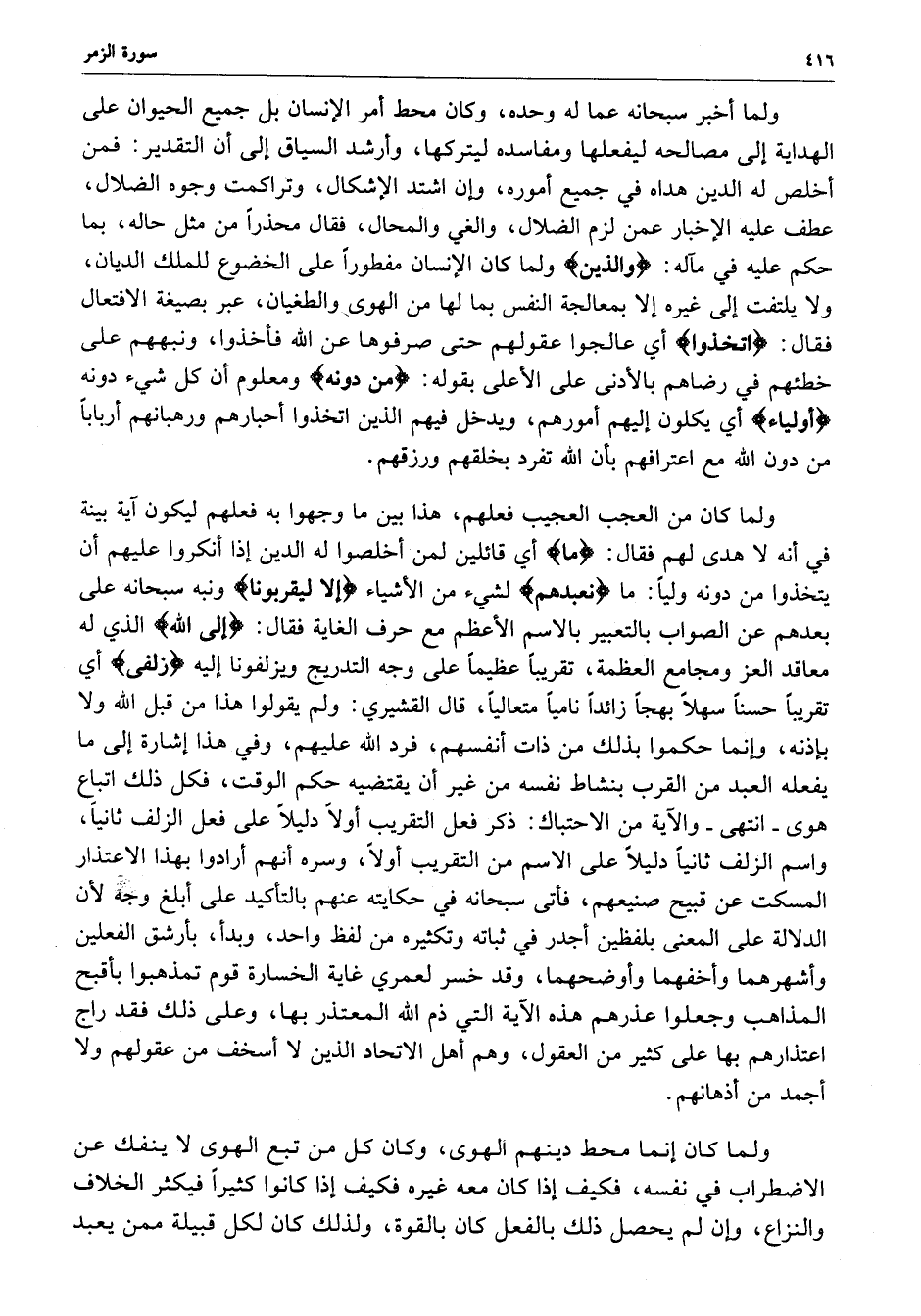 ولما كان من العجب العجيب فعلهم ، هذا بين ما وجهوا به فعلهم ليكون آية بينة في أنه لا هدى لهم فقال : ( ما ) أي قائلين لمن أخلصوا له الدين إذا أنكروا عليهم أن يتخذوا من دونه ولياً : ما ) نعبدهم ( لشيء من الأشياء ) إلا ليقربونا ( ونبه سبحانه على بعدهم عن الصواب بالتعبير بالاسم الأعظم مع حرف الغاية فقال : ( إلى الله ( الذي له معاقد العز ومجامع العظمة ، تقريباً عظيماً على وجه التدريج ويزلفونا إليه ) زلفى ) أي تقريباً حسناً سهلاً بهجاً زائداً نامياً متعالياً ، قال القشيري : ولم يقولوا هذا من قبل الله ولا بإذنه ، وإنما حكموا بذلك من ذات أنفسهم ، فرد الله عليهم ، وفي هذا إشارة إلى ما يفعله العبد من القرب بنشاط نفسه من غير أن يقتضيه حكم الوقت ، فكل ذلك اتباع هوى انتهى والاية من الاحتباك : ذكر فعل التقريب أولاً دليلاً على فعل الزلف ثانياً ، واسم الزلف ثانياً دليلاً على الاسم من التقريب أولاً ، وسره أنهم أرادوا بهذا الاعتذار المسكت عن قبيح صنيعهم ، فأتى سبحانه في حكايته عنهم بالتأكيد على أبلغ وجه لأن الدلالة على المعنى بلفظين وأوضحهما ، وقد خسر لعمري غاية الخسارة قوم تمذهبوا بأقبح المذاهب وجعلوا عذرهم هذه الآية التي ذم الله المعتذر بها ، وعلى ذلك فقد راج اعتذارهم بها على كثير من العقول ، وهم أهل الاتحاد الذين لا أسخف من عقولهم ولا أجمد من أذهانهم .