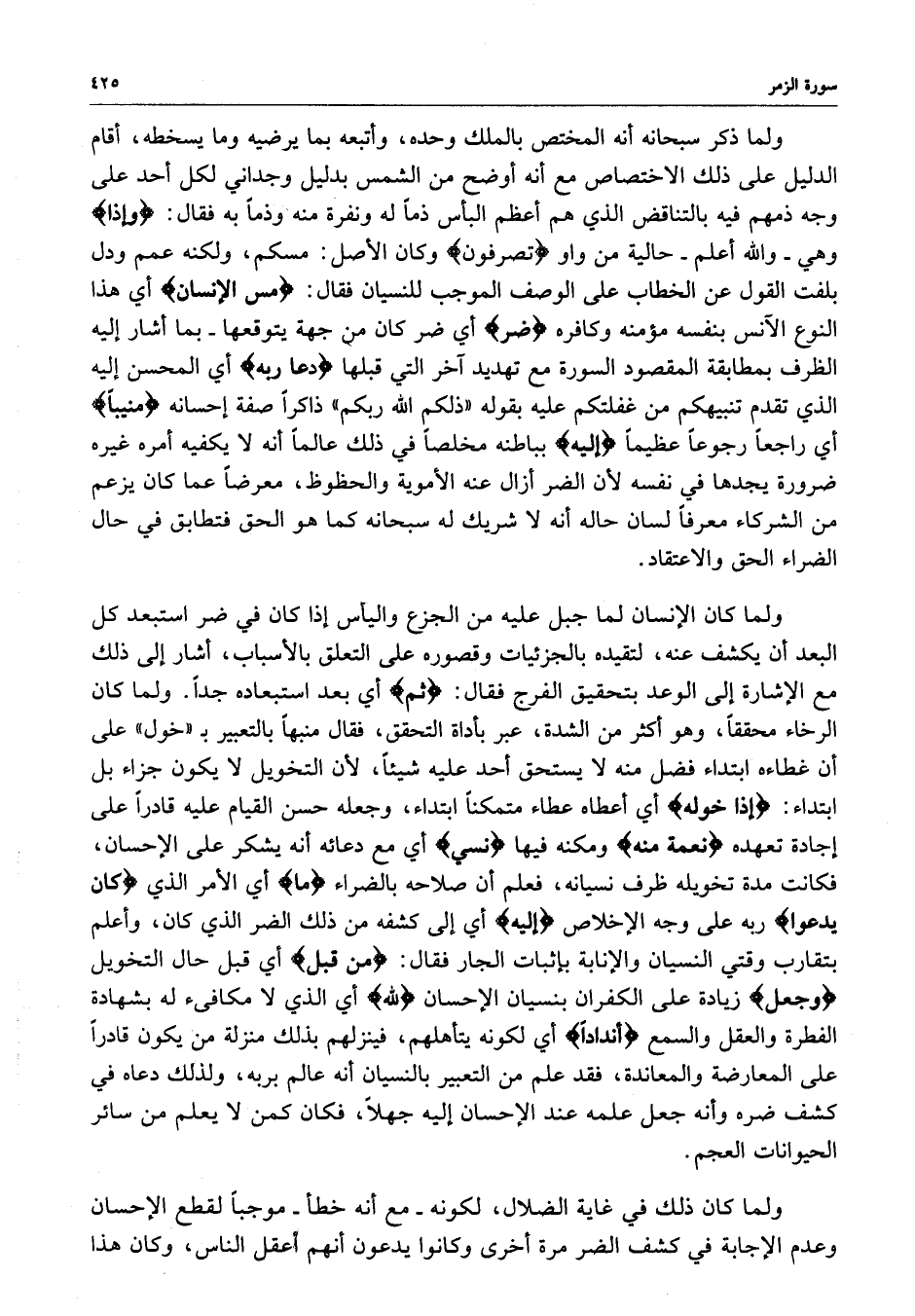ولما كان الرخاء محقاً ، وهو أكثر من الشدة ، عبر بأداة التحقق ، فقال منبهاً بالتعبير ب ( خول ) على أن غطاءه ابتداء فضل منه لا يستحق أحد عليه متمكناً ابتداء ، وجعله حسن القيام عليه قادراً على إجادة تعهده ) نعمة منه ( ومكنه فيها ) نسي ) أي مع دعائه أن يشكر على الإحسان ، فكانت مدة تخويله ظرف نسيانه ، فعلم أن صلاحه بالضراء ) ما ) أي الأمر الذي ) كان يدعوا ( ربه على وجه الإخلاص ) إليه ( إلى كشفه من ذلك الضر الذي كان ، وأعلم بتقارب وقتي النسيان والإنابة بإثبات الجار فقال : ( من قبل ) أي قبل حال التخويل بتقارب وقتي النسيان والإنابة بإثبات الجار فقال : ( لله ) أي الذي لا مكافئ له بشهادة الفطرة والعقل والسمع ) أنداداً ) أي لكونه يتأهلهم ، فينزلهم بذلك منزلة من يكون قادراً على المعارضة والمعاندة ، فقد علم من التعبير بالنسيان أنه عالم بربه ، ولذلك دعاه في كشف ضره وأنه جعل علمه عند الإحسان إليه جهلاً ، فكان كمن لا يعلم من سائر الحيوانات العجم .