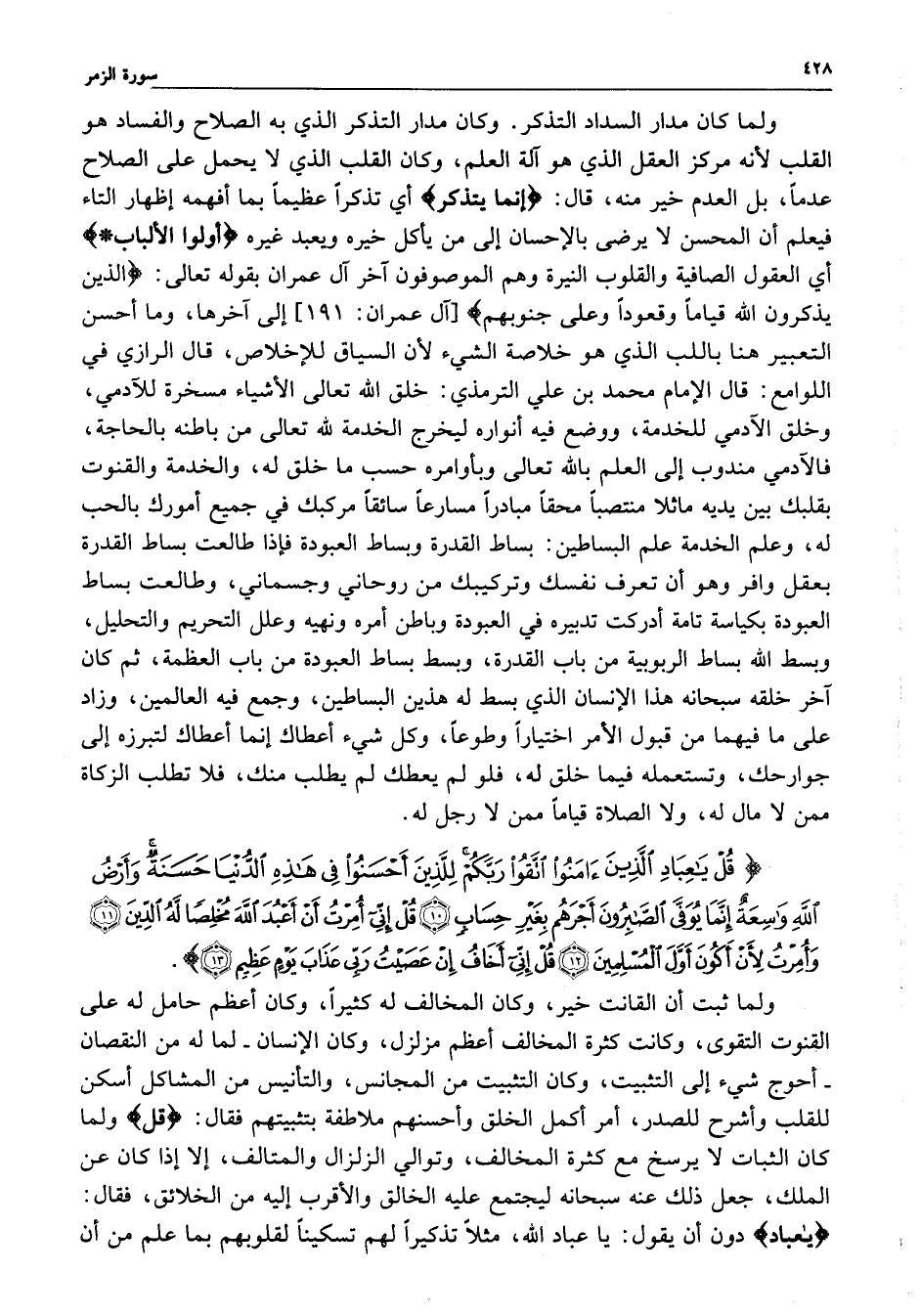 ) قُلْ يعِبَادِ الَّذِينَ آمَنُواْ اتَّقُواْ رَبَّكُمْ لِلَّذِينَ أَحْسَنُواْ فِي هَذِهِ الدُّنْيَا حَسَنَةٌ وَأَرْضُ اللَّهِ وَاسِعَةٌ إِنَّمَا يُوَفَّى الصَّابِرُونَ أَجْرَهُمْ بِغَيْرِ حِسَابٍ قُلْ إِنِّي أُمِرْتُ أَنْ أَعْبُدَ اللَّهَ مُخْلِصاً لَّهُ الدِّينَ وَأُمِرْتُ لأَنْ أَكُونَ أَوَّلَ الْمُسْلِمِينَ قُلْ إِنِّي أَخَافُ إِنْ عَصَيْتُ رَبِّي عَذَابَ يَوْمٍ عَظِيمٍ ( ( )