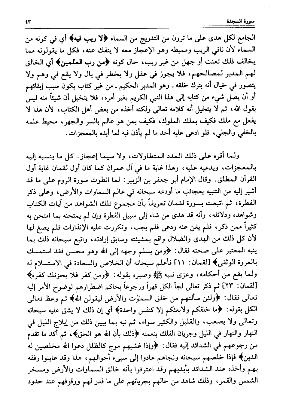 ولما أقره على ذلك المدد المتطاولات ، ولا سيما إعجاز ، كل ما ينسبه إليه بالمعجزات ، ويدعيه عليه ، ما في آل عمران كمات كان أول لقمان غاية أول القرآن المطلق. وقال الإمام أبو جعفر بن الزبير : لما انطوت سورة الروم على ما قد أشير إليه من التنبيه بعجائب ما أودعه سبحانه وتعالى في عالم السماوات والأرض ، وعلى ذكر الفطرة ، ثم اتبعت بسورة لقمان تعريفا بأن مجموع تلك الشواهد من آيات الكتاب وشواهده ودلائله ، وأنه قد هدى من شاء إلى سبيل الفطرة وإن لم يمتحنه بما امتحن به كثيرا ممن ذكر ، فلم يغن عنه ودعى فلم يجب ، وتكررت عليه الإنذارات فلم يصغ لها ، لأن كل ذلك من الهدى والضلال واقع بمشيئته وسابق إرادته ، واتبع سبحانه ذلك بما ينبه المعغتبر على صحته فقلا : ( ومن يسلم وجهه إلى الله وهو محسن فقد استمسك بالعروة الوثقى ) [ لقمان : 11 ] فأعلم سبحانه أن الخلاص والسعادة يفي الاستسلام له ولما يقع من أحكامه ، وعزى نبيه ( صلى الله عليه وسلم ) وصبره بقوله : ( ومن كفر فلا يحزنك كفره ) [ لقمان : 23 ] ثم ذكر تعالى لجأ الكل قهرا ورجوعا يحاكم اضطرارهم لوضوح الأمر إليه تعالى فقال : ( وائن سألتهم من خلق السماوات والأرض ليقولن الله ( ثو وعظ تعالى الكل بقوله ) ما خلقكم ولا بعثكم إلا كنفس واحدة ) أي إن ذلك لا يشق عليه سبحانه وتعالى ولا يصعب ، والقليل والكثير سواء ، ثم نبه بما يبين ذلك من إيلاج الليل يفي النهار والنهار قي الليل وجريان الفلك بنعمته ) ذلك بأن الله هو الحق ( ، ثم أكد ما تقدم من رجوعهم يفي الشدائد إليه فقال : ( وإذا غشيهم موج كالظلل دعوا الله مخلصبن له الدين ( فإذا خلصهم سبحانه وتعالة ونجاهم عادوا إلى سيئ أحوالهم ، هذا وقد عاينوا رفقه بهم وأخذه عند الشدائد بأيديهم وقد اعترفوا بأنه خالق السماوات والأرض ومسخر الشمس والقمر ، وذلك شاهد من حالهم بجريانهم على ما قدر لهم ووقوفهم عند حدود ،