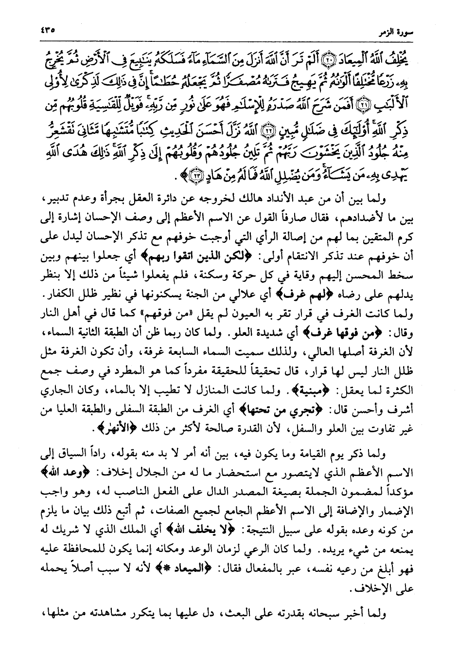 يُخْلِفُ اللَّهُ الْمِيعَادَ أَلَمْ تَرَ أَنَّ اللَّهَ أَنزَلَ مِنَ السَّمَآءِ مَآءً فَسَلَكَهُ يَنَابِيعَ فِي الأَرْضِ ثُمَّ يُخْرِجُ بِهِ زَرْعاً مُّخْتَلِفاً أَلْوَانُهُ ثُمَّ يَهِيجُ فَتَرَاهُ مُصْفَرّاً ثُمَّ يَجْعَلُهُ حُطَاماً إِنَّ فِي ذَلِكَ لَذِكْرَى لأُوْلِي الأَلْبَابِ أَفَمَن شَرَحَ اللَّهُ صَدْرَهُ لِلإِسْلاَمِ فَهُوَ عَلَى نُورٍ مِّن رَّبِّهِ فَوَيْلٌ لِّلْقَاسِيَةِ قُلُوبُهُمْ مِّن ذِكْرِ اللَّهِ أُوْلَئِكَ فِي ضَلاَلٍ مُّبِينٍ اللَّهُ نَزَّلَ أَحْسَنَ الْحَدِيثِ كِتَاباً مُّتَشَابِهاً مَّثَانِيَ تَقْشَعِرُّ مِنْهُ جُلُودُ الَّذِينَ يَخْشَوْنَ رَبَّهُمْ ثُمَّ تَلِينُ جُلُودُهُمْ وَقُلُوبُهُمْ إِلَى ذِكْرِ اللَّهِ ذَلِكَ هُدَى اللَّهِ يَهْدِي بِهِ مَن يَشَآءُ وَمَن يُضْلِلِ اللَّهُ فَمَا لَهُ مِنْ هَادٍ ) 73