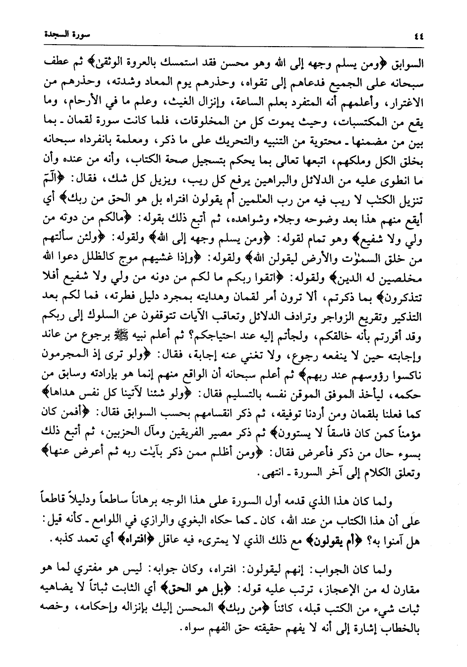 السوابق ) ومن يسلم وجهه إلى الله وهو محسن فقد استمسك بالعروة الوثقى ( ثم عطف سبحانه على الجميع فدعاهم إلى تقواه ، وحذرهم يوم المعاد وشدته ، وحذرهم من الاغترار ، وأعلمهم أنه المتفرد بعلم الساعة ، وإنزال الغيث ، وعلم ما في الأرحام ، وما يقع من المكتسبات ، وحيث يموت كل من الخلوقات ، فلما كانت سورة لقمان - بما بين من مضمنها - محتوية من التنبيه والتحريك على ما ذكر ، ومعلمة بانفراده سبحانه بخلق الكل وملكهم ن اتبعها تعالى بما يحكم بتسجيل صحة الكتاب ، وأنه من عنده وأن ما انطوى عليه من الدلائل والبراهين يرفع كل ريب ، ويزيل كل شك ،