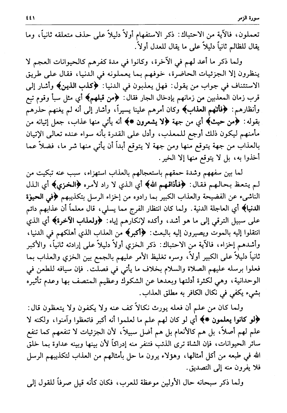 ولما كان من علم أنه فعله يورث نكالاً كف عنه ولا يكفون ولا يتعظون قال : ( لو كانوا يعلمون ) أي لو كان لهم علم ما لعلموا أنه أكبر فاتعظوا وآمنوا ، ولكنه لا علم لهم أصلاً ، بل هم كالأنعام بل هم أضل سبيلاً ، لأن الجزئيات لا تنفعهم كما تنفع سائر الحيوانات ، فإن الشاة ترى الذئب فتنفر منه إدراكاً لأن بينها وبينه عداوة بما خلق الله في طبعه من أكل أمثالها ، وهؤلاء يرون ما حل بأمثالهم من العذاب لتكذيبهم الرسل فلا يفرون منه إلى التصديق .