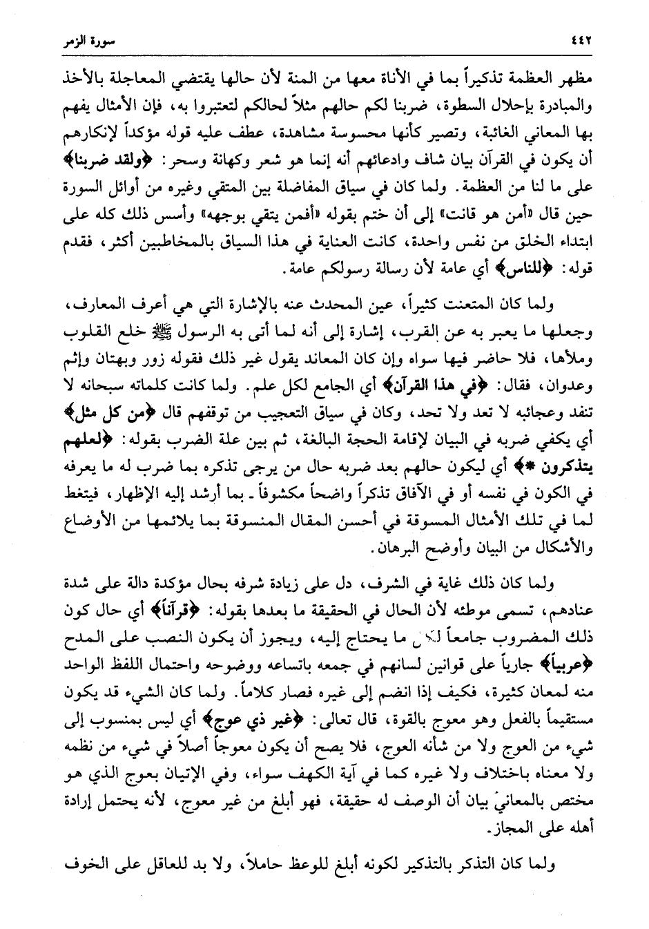 مظهر العظمة تذكيراً بما في الأناة من المنة لأن حالها يقتضي المعاجلة بالأخذ والمبادرة بإحلال السطوة ، ضربنا لكم حالهم مثلا لحالكم لتعتبروا به ، فإن الأمثال يفهم بها المعاني الغائبة ، وتصير كأنها محسوسة مشاهدة ، عطف عليه قوله مؤكداً لإنكارهم أن يكون في القرآن بيان شاف وادعائهم أنه إنما هو شعر وكهانة وسحر : ( ولقد ضربنا ( على ما لنا من العظمة .