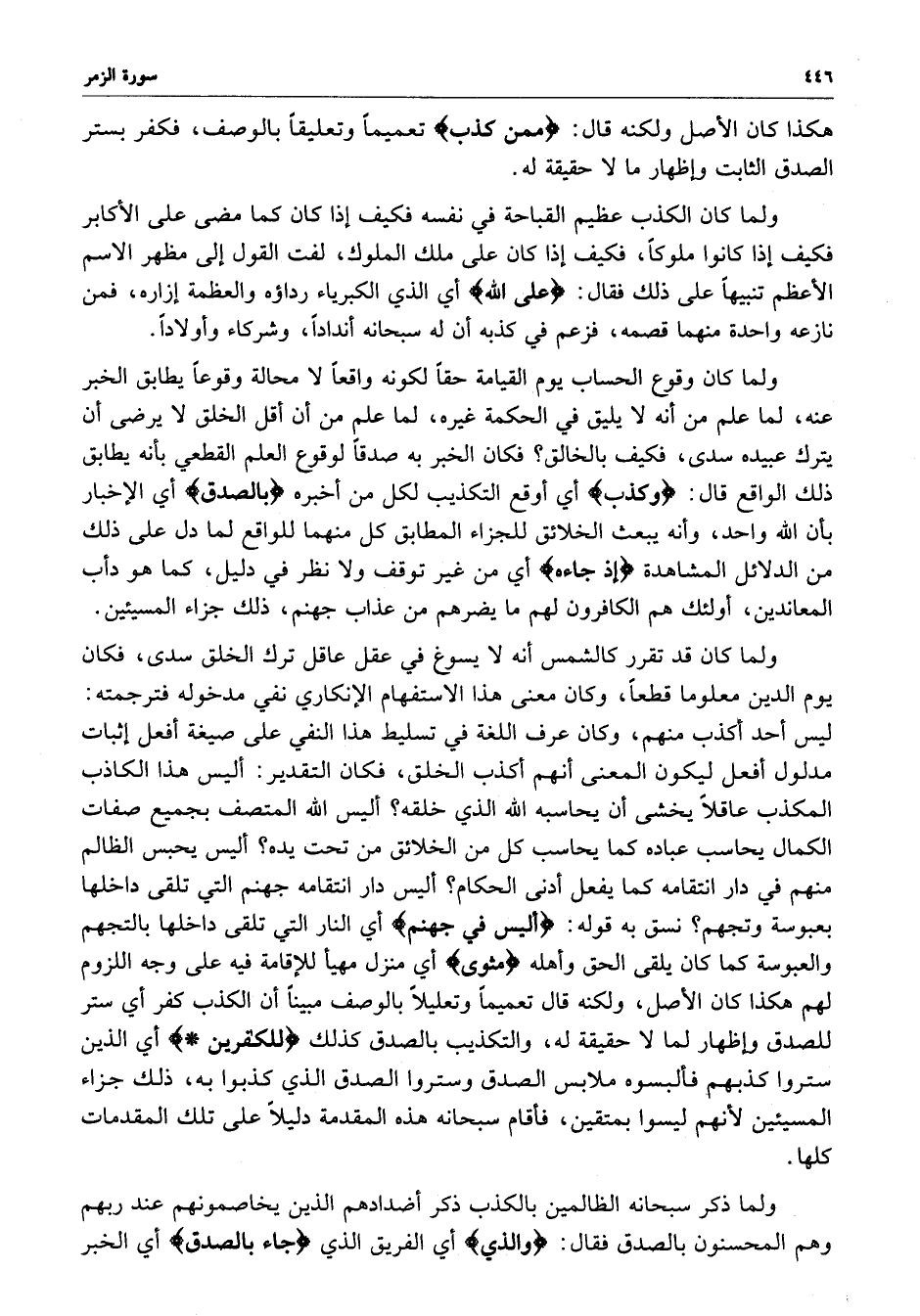 ولما كان قد تقرر كالشمس أنه لا يسوغ في عقل العاقل ترك الخلق سدى ، فكان يوم الدين معلوماً قطعاً ، وكان معنى هذا الاستفهام الإنكاري نفي مدخوله فترجمته : ليس أحد أكذب منهم ، وكان عرف اللغة في تسليط هذا النفي على صيغة أفعل إثبات مدلول افعل ليكون المعنى أنهم أكذب الخلق ، فكان التقدير : أليس هذا الكاذب المكذب عاقلاً يخشى أن يحاسبه الله كل خلقه ؟ أليس الله المتصف بجميع صفات الكمال يحاسب عباده كما يحاسب كل من الخلائق من تحت يده ؟ أليس يحبس الظالم منهم في دار انتقامه كما يفعل أدنى الحكام ؟ أليس دار انتقامه جهنم التي تلقى داخلها بعبوسة وتجهم ؟ نسق به قوله : ( أليس في جهنم ) أي النار النار تلقى داخلها بالتجهم والعبوسة كما كان يلقى الحق وأهله ) مثوى ) أي منزل مهيأ للإقامة فيه على وجه اللزوم لهم هكذا كان الأصل ، ولكنه قال تعميماً وتعليلاً بالوصف مبيناً أن الكذب كفر أي ستر للصدق وغظهار لما لا حقيقة له ، والتكذيب بالصدق كذلك ) للكافرين ) أي الذين ستروا كذبهم فألبسوه ملابس الصدق وستروا الصدق الذي كذبوا به ، ذلك جزاء المسيئين لأنهم ليسوا بمتقين ، فأقام سبحانه هذه المقدمة دليلاً على تلك المقدمات كلها .
