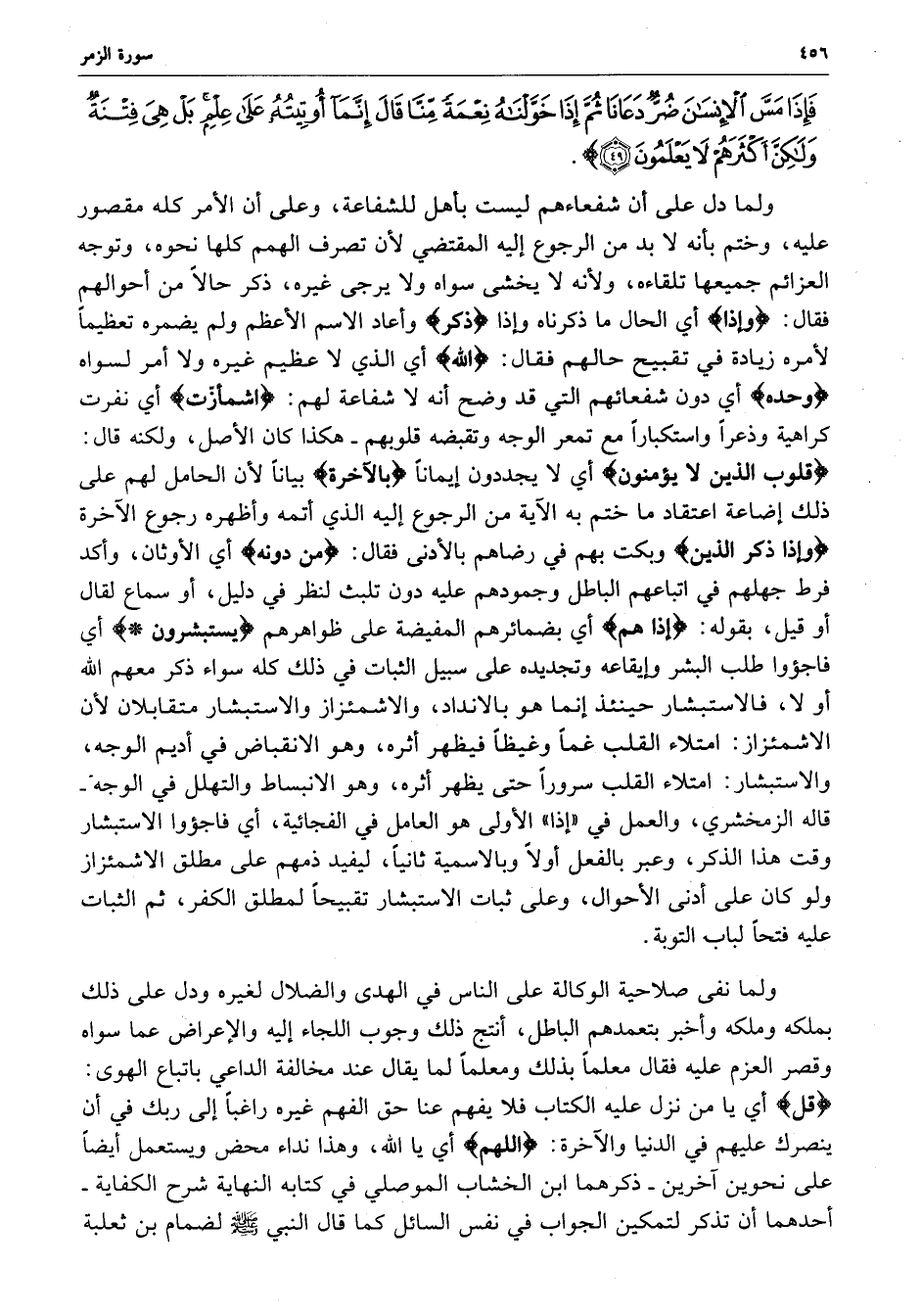 ولما دل على أن شفعاءهم ليست بأهل للشفاعة ، وعلى أن الأمر كله مقصور عليه ، وختم بأنه لا بد من الرجوع إليه المقتضي لأن تصرف الهمم كلها نحوه ، وتوجه العزائم جميعها تلقاءه ، ولأنه لا يخشى سواه ولا يرجى غيره ، ذكر حالاً من أحوالهم فقال : ( وإذا ) أي الحال ما ذكرناه وإذا ) ذكر ( وأعاد الاسم الأعظم ولم يضمره تعظيماً لأمره زيادة في تقبيح حالهم فقال : ( الله ) أي الذي لا عظيم غيره ولا أمر لسواه ) وحده ) أي دون شفعائهم التي قد وضح أنه لا شفاعة لهم : ( اشمأزّت ) أي نفرت كراهية وذعراً واستكباراً مع تعمر الوجه وتقبضه قلوبهم - هكذا كان الأصل ، ولكنه قال : ( قلوب الذين لا يؤمنون ) أي لا يجددون إيماناً ) بالآخرة ( بياناً لأن الحامل لهم على ذلك إضاعة اعتقاد ما ختم به الآية من الرجوع إليه الذي أتمه واظهره رجوع الآخرة ) وإذا ذكر الذين ( وبكت بهم في رضاهم بالأدنى فقال : ( من دونه ) أي الأوثان ، وأكد فرط جهلهم في اتباعهم الباطل وجمودهم عليه دون تلبث لنظر في دليل ، أو سماع لقال أو قيل ، بقوله : ( إذا هم ) أي بضمائرهم المفيضة على ظواهرهم ) يستبشرون ) أي فاجؤوا طلب البشر وإيقاعه وتجديده على سبيل الثبات في ذلك كله سواء ذكر معهم الله أو لا ، فالاستبشار حينئذ إنما هو بالانداد ، والاشمئزاز والاستبشار متقابلان لأن الاشمئزاز : امتلاء القلب غماً وغيظاً فيظهر أثره ، وهو الانقباض في أديم الوجه ، والاستبشار : امتلاء القلب سروراً حتى يظهر أثره ، وهو الانبساط والتهلل في الوجه - قال الزمخشري ، والعمل في ( إذ ) الأولى هو العامل في الفجائية ، أي فاجؤوا الاستبشار وقت هذا الذكر ، وعبر بالفعل اولاً وبالاسمية ثانياً ، ليفيد ذمهم على مطلق الاشمئزاز ولو كان على أدنى الأحوال ، وعلى ثبات الاستبشار تقبيحاً لمطلق الكفر ، ثم الثبات عليه فتحاً لباب التوبة .