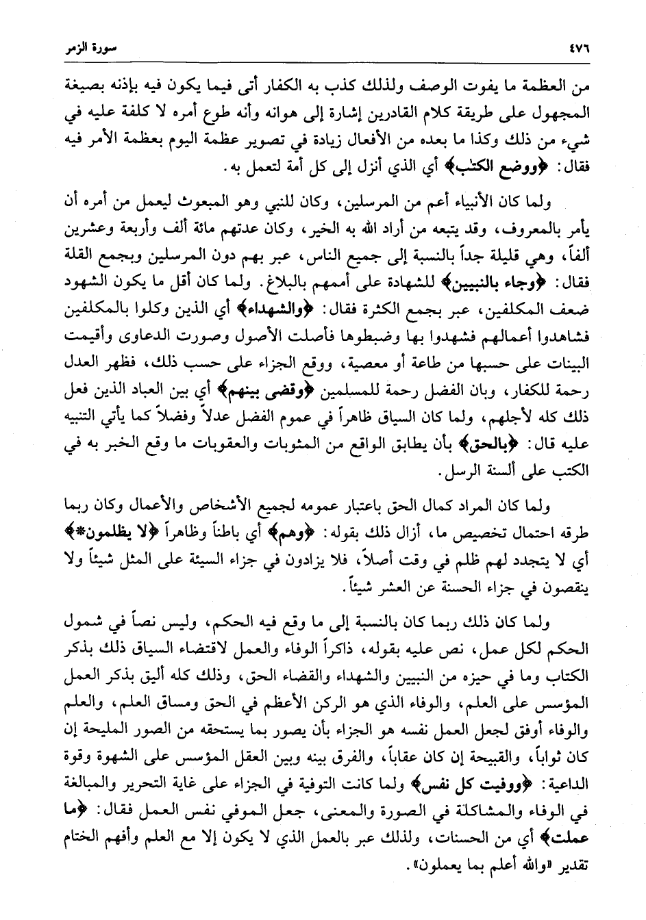 ولما كان ذلك ربما كان بالنسبة إلى ما وقع فيه الحكم ، وليس نصاً في شمول الحكم لكل عمل ، نص عليه بقوله ، ذاكراً الوفاء والعمل لاقتضاء السياق ذلك بذكر الكتاب وما في حيزه من النبيين والشهداء والقضاء الحق ، وذلك كله أليق بذكر العمل المؤسس على العلم ، والوفاء الذي هو الركن الأعظم في الحق ومساق العلم ، والعلم والوفاء أوفق لجعل العمل نفسه هو الجزاء بأن يصور بما يستحقه من الصور المليحة إن كان ثواباً والقبيحة إن كان عقاباً ، والفرق بينه وبين العقل المؤسس على الشهوة وقوة الداعية : ( ووفيت كل نفس ( ولما كانت التوفية في الجزاء على غاية التحرير والمبالغة في الوفاء والمشاكلة في الصورة والمعنى ، جعل الموفي نفس العمل فقال : ( ما عملت ) أي من الحسنات ، لذلك عبر بالعمل الذي لا يكون إلا مع العلم وأفهم الختام تقدير ( والله أعلم بما يعملون ) .