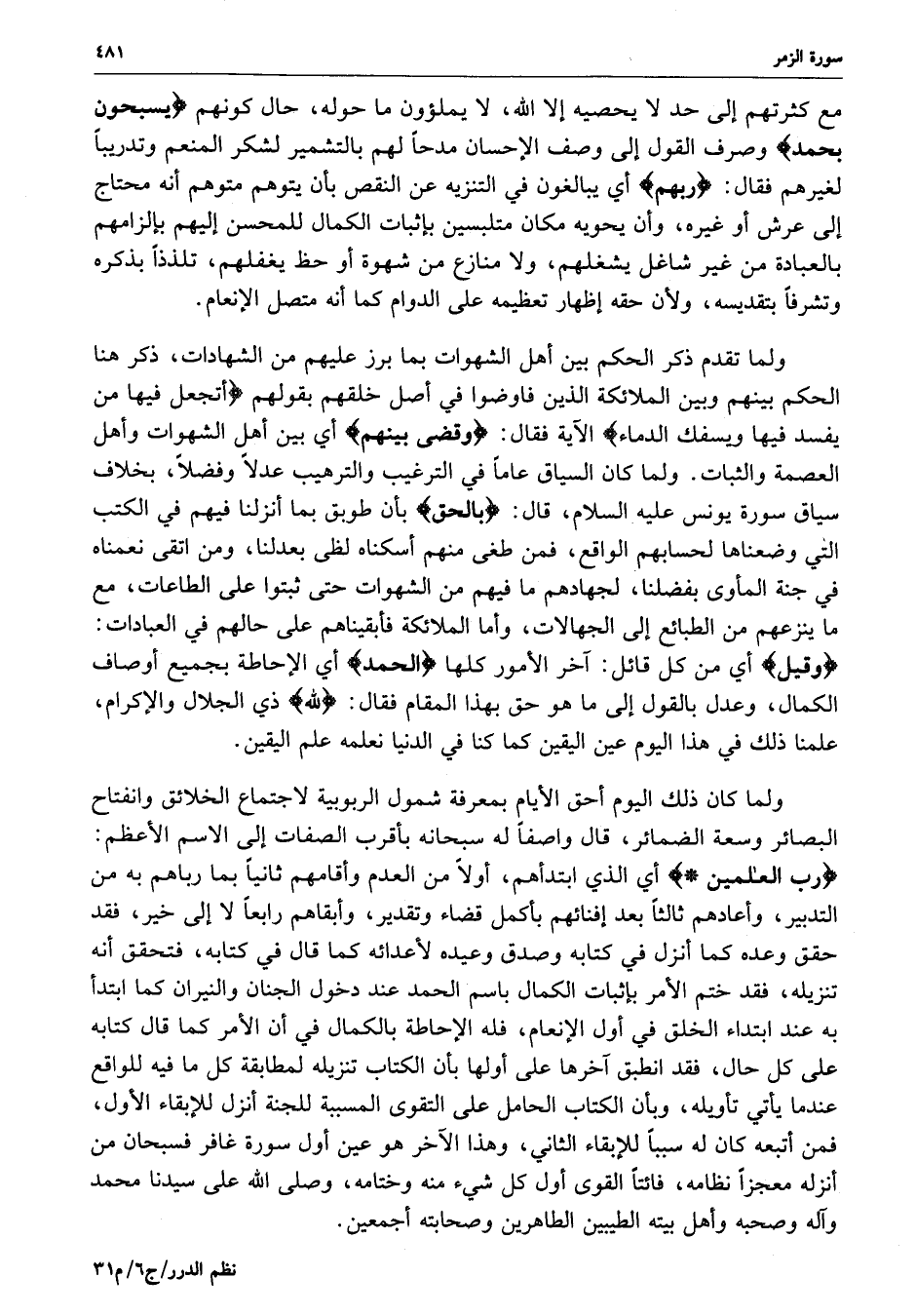 ولما كان ذلك اليوم أحق الأيام بمعرفة شمول الربوبية لاجتماع الخلائق وانفتاح البصائر وسعة الضمائر ، قال واصفاً له سبحانه بأقرب الصفات إلى الاسم الأعظم : ( رب العالمين ) أي الذي ابتدأهم ، أولاً من العدم وأقامهم ثانياً بما رباهم به من التدبير ، وأعادهم ثالثاً بعد إفنائهم بأكمل قضاء وتقدير ، وأبقاهم رابعاً لا إلى خير ، فقد حقق وعده كما أنزل في كتابه وصدق وعيده لأعدائه كما قال في كتابه ، فتحقق أنه تنزيله ، فقد ختم الأمر بإثبات الكمال باسم الحمد عند دخول الجنان والنيران كما ابتدأ به عند ابتداء الخلق في أول الإنعام ، فله الإحاطة بالكمال في أن الأمر كما قال كتابه على كل حال ، فقد انطبق آخرها على أولها بأن الكتاب تنزيله لمطابقة كل ما فيه للواقع عندما يأتي تأويله ، وبأن الكتاب الحامل على التقوى المسببة للجنة أنزل للإبقاء الأول ، فمن أتبعه كان له سبباً للإبقاء الثاني ، وهذا الآخر هو عين أول سورة غافر فسبحان من أنزله معجزاً نظامه ، فائتاً القوى أول كل شيء منه وختامه ، وصلى الله على سيدنا محمد وآله وصحبه وأهل بيته الطيبين الطاهرين وصحابته أجمعين .