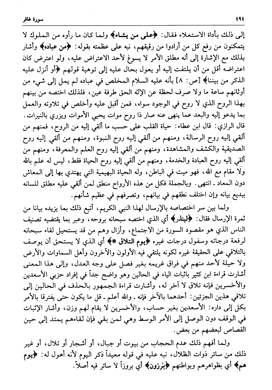 ولما بين سر اختصاصه بالإرسال لهذا النبي الكريم ، أتبع ذلك بما يزيده بياناً من ثمرة الإرسال فقال : ( لينذر ) أي الذي اختصه سبحانه بروحه ، وعبر بما يقتضيه تصنيف الناس الذي هو مقصود السورة من الاجتماع ، وأزال وهم من قد يستحيل لقاء سبحانه لرفعه درجاته وسفول درجات غيره ) يوم التلاق ) أي الذي لا يستحق أن يوصف بالتلاقي على الحقيقة غيره لكونه يلتقي فيه الأولون والآخرون وأهل السماوات والأرض ولا حيلة لأحد منهم في فراق غريمه بغير فصل على وجه العدل ، وإلى هذا المعنى أشارت قراءة ابن كثير باثبات الياء في الحالين وهو واضح جداً في إفراد حزبي الأسعدين والأخسرين فإنه تلاق لا آخر له ، وأشارت قراءة الجمهور بالحذف في الحالين إلى تلاقي هذين الجزئين : أحدهما بالآخر فإنه - والله أعلم - قل ما يكون حتى يفترقا بالأمر بكل إلى داره : الأسعدين بغير حساب ، والأخسرين لا يقام لهم وزن ، وأشار الإثبات في الموقف دون الوصل إلى الأمر الوسط وهي لمن بقي لقاءهم يمتد إلى حين القصاص لبعضهم من بعض .