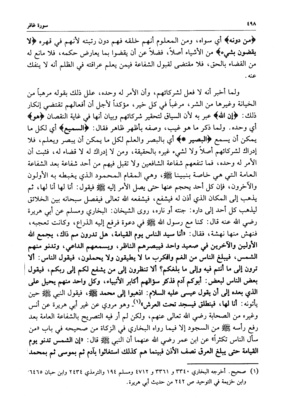 ولما ذكر ما هو غيب ، وصفه بأظهر فقال : ( السميع ) أي لكل ما يمكن أن يسمع ) البصير ) أي بالبصر والعلم لكل ما يمكن أن يبصر ويعلم ، فلا إدراك لشركائهم أصلاً ولا لشيء غيره بالحقيقة ، ومن لا إدراك له ولا قضاء له ، فثبت أن الأمر له وحده ، فما تنفعهم شفاعة الشافعين ولا تقبل فيهم من أحد شفاعة بعد الشفاعة العامة التي هي خاصة بنبينا ( صلى الله عليه وسلم ) ، وهي المقام المحمود الذي يغبطه به الأولون والآخرون ، فإن كل أحد يحجم عنها ختى يصل الأمر إليه ( صلى الله عليه وسلم ) فيقول : أنا لها أنا لها ، ثم يذهب إلى المكان الذي أذن له فيشفع ، فيشفعه الله تعالى فيفصل سبحانه بين الخلائق ليذهب كل أحد إلى داره : جنته أو ناره ، ورى الشيخان : البخاري ومسلم عن أبي هريرة رضي الله عنه قال : كما مع رسول الله ( صلى الله عليه وسلم ) في دعوة فرفع إليه الذراع ، وكانت تعجبه ، فنهش منها نهشة ، فقال : ( أنا سيد الناس يوم القيامة ، هل تدرون مم ذاك ، يجمع الله الأولين والاخرين في صعيد واحد فيبصرهم الناظر ، ويسمعهم الداعي ، وتدنو منهم الشمس ، فيبلغ الناس من الغم والكرب ما لا يطيقون ولا يحملون ، فيقول الناس : ألا ترون إلى ما أنتم فيه وإلى ما بلغكم ؟ ألا تنظرون إلى من يشفع لكم إلى ربكم ، فيقول بعض الناس لبعض : أبوكم آدم فذكر سؤالهم أكابر الأنبياء ، وكل واحد منهم يحيل على الذي يعده ألى أن يقول عيسى عليه السلام : اذهبوا إلى محمد ( صلى الله عليه وسلم ) ، فيقول النبي ( صلى الله عليه وسلم ) حين يأتونه : أنا لها ، فينطلق فيسجد تحت العرش ) وهو مروي عن غير أبي هريرة عن أنس وغيره من الصحابة رضي الله تعالى عنهم ، ولكن لم أر فيه التصريح بالشفاعة العامة بعد رفع رأسه ( صلى الله عليه وسلم ) من السجود إلا فيما رواه البخاري في الزكاة من صحيحه في باب ( من سأل الناس تكثراً ) عن ابن عمر رضي الله عنهما أن النبي ( صلى الله عليه وسلم ) : قال : ( إن الشمس تدنو يوم القيامة حتى يبلغ العرق نصف الأذن فبينما هم كذلك استغاثوا بآدم ثم بموسى ثم بمحمد