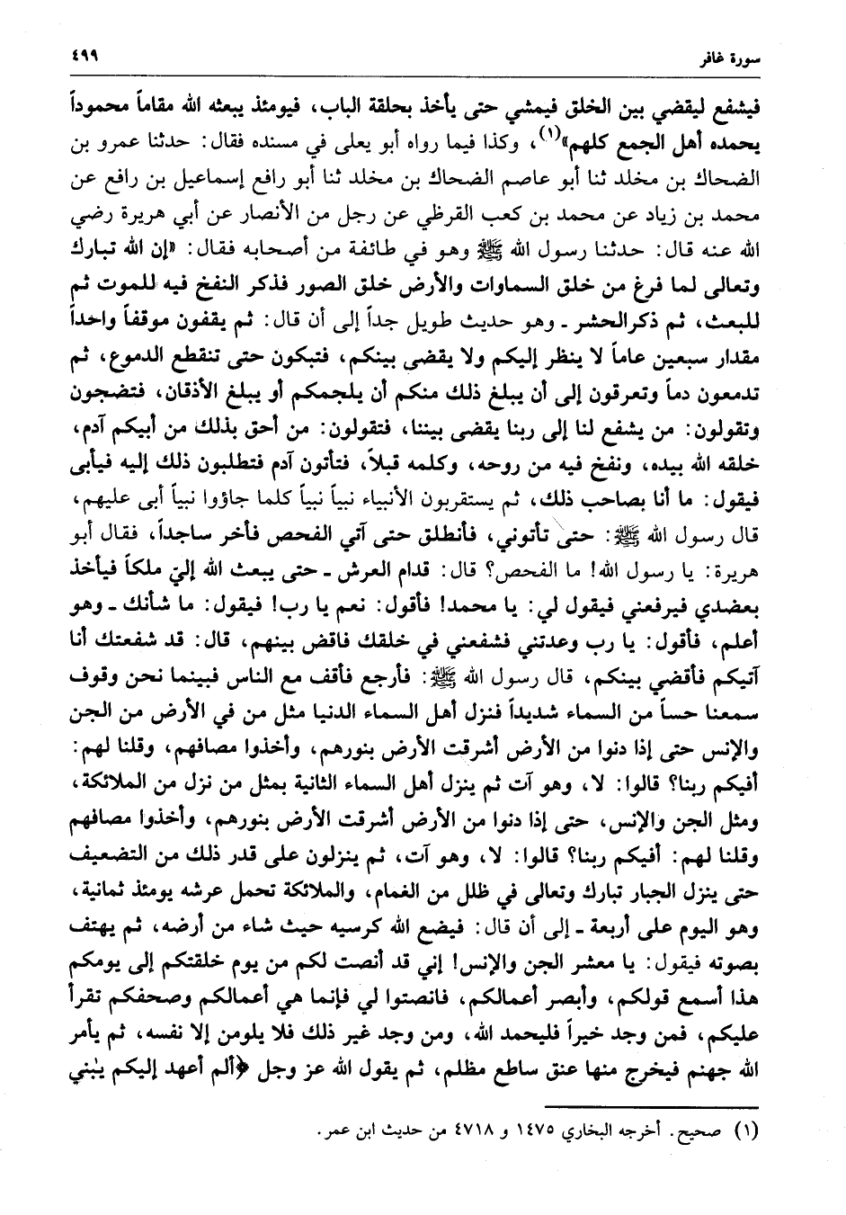فيشفع ليقضي بين الخلق فيمشي حتى يأخذ بحلقة الباب ، فيومئذ يبعثه الله مقاماً محموداً يحمده أهل الجمع كلهم ) ، وكذا فيما رواه أيو يعلى في مسنده فقال : حدثنا عمرو بن الضحاك بن مخلد ثنا أبو عاصم الضحاك بن مخلد ثنا أبو رافع إسماعيل بن رافع عن محمد بن زياد عن محمد بن كعب القرظي عن رجل من الأنصار عن أبي هريرة رضي الله عنه قال : حدثنا رسول الله ( صلى الله عليه وسلم ) وهو في طائفة من أصحابه فقال : ( إن الله تبارك وتعالى لما فرغ من خلق السماوات والأرض خلق الصور فذكر النفخ فيه للموت ثم للبعث ثم ذكر الحشر ) وهو حديث طويل جداً إلى أن قال ( ثم يقفون موقفاً واحداً مقدار سبعين عاماً لا ينظر إليكم ولا يقضى بينكم ، فتبكون حتى تنقطع الدموع ، ثم تدمعون دماً وتعرقون إلى أن يبلغ ذلك منكم أن يلجمكم أو يبلغ الأذقان ، فتضجون وتقولون : من يشفع لنا إلى ربنا يقضى بيننا ، فتقولون : من أحق بذلك من أبيكم آدم ، خلقه الله بيده ، ونفخ فيه من روحه ، وكلمه قبلاً ، فتأتون آدم فتطلبون ذلك إليه فيأبى فيقول : ما أنا بصاحب ذلك ) ثم يستقربون الأنبياء نبياً نبياً كلما جاؤوا نبياً أبى عليهم ، قال رسول الله ( صلى الله عليه وسلم ) ( حتى تأتوني ، فأنطلق حتى آتي الفحص فأخر ساجداً ) فقال أبو هريرة : يا رسول الله ما الفحص ؟ قال ( قدام العرش - حتى يبعث الله إليّ ملكاً فيأخذ بعضدي فيرفعني فيقول لي : يا محمد فأقول : نعم يا رب فيقول : ما شأنك - وهو أعلم فأقول : يا رب وعدتني فشفعني في خلقك فاقض بينهم ، قال : قد شفعتك أنا آتيكم فأقضي بينكم ) قال رسول الله ( صلى الله عليه وسلم ) ( فأرجع فأقف مع الناس فبينما نحن وقوف سمعنا حساً من السماء شديداً فنزل أهل السماء الدنيا مثل من في الأرض من الجن والإنس حتى إذا دنوا من الأرض أشرقت الأرض بنورهم ، وأخذوا مصافهم وقلنا لهم : أفيكم ربنا ؟ قالوا : لا ، وهو آت ثم ينزل أهل السماء الثانية بمثل من نزل من الملائكة ، ومثل الجن والإنس ، حتى إذا دنوا من الأرض أشرقت الأرض بنورهم ، وأخذوا مصافهم وقلنا لهم : أفيكم ربنا ؟ قالوا : لا ، وهو آت ، ثم ينزلون على قدر ذلك من التضعيف حتى ينزل الجبار تبارك وتعالى في ظلل من الغمام ، والملائكة تحمل عرشه يومئذ ثمانية ، وهو اليوم على أربعة ) إلى أن قال ( فيضع الله كرسيه حيث شاء من أرضه ، ثم يهتف بصوته فيقول : يا معشر الجن والإنس إني قد أنصت لكم من يوم خلقتكم إلى يوم يومكم هذا أسمع قولكم ، وأبصر أعمالكم ، فانصتوا لي فإنما هي أعمالكم وصحفكم تقرأ عليكم ، فمن وجد خيراً فليحمد الله ، ومن وجد غير ذلك فلا يلومن إلا نفسه ، ثم يأمر الله جهنم فيخرج منها عنق ساطع مظلم ، ثم يقول الله عز وجل ) ألم أعهد إليكم يا بني