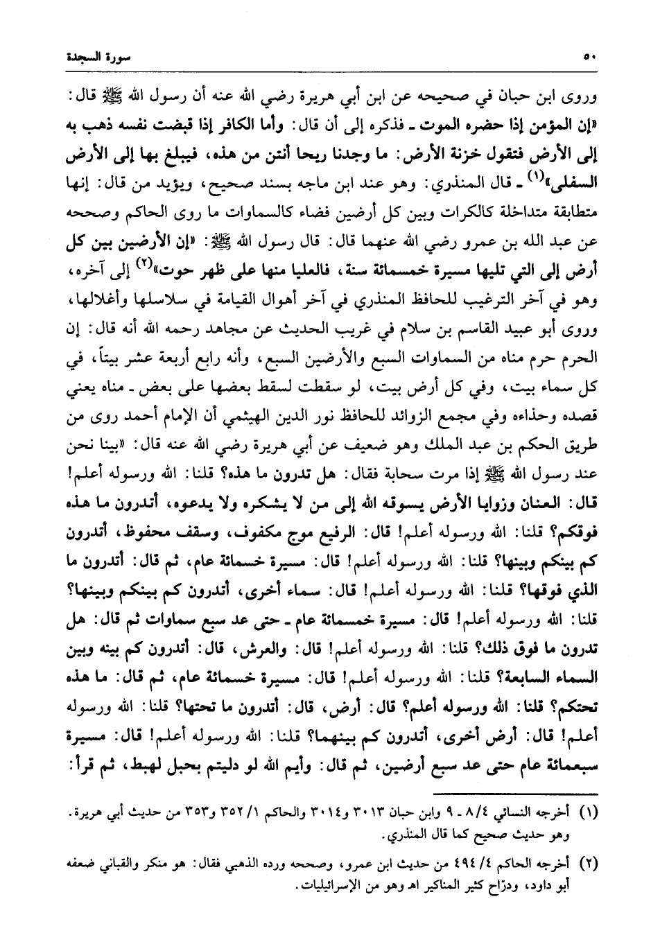 وروى ابن حبان في صحيحه عن ابن أبي هريرة رضي الله عنه أن رسول الله ( صلى الله عليه وسلم ) قال : ( إن المؤمن إذا حضره الموت - فذكره إلى أن قال : وأما الكافر إذا قبضت نفسه ذهب به إلى الأرض فنقول خزنة الأرض : ما وجدنا ريحا أنتن من هذه ، فيبلغ بها إلى الأرض السفلى ) - قال المنذري : وهو عند ابن كاجه يسند صحيح ، ويؤيد من قال : إنها متطابقة متداخلة كالكرات وبين كل أرضين فضاء كالسماوات ما روى الحاكم وصححه عند عبدالله بن عمرو رضي الله عنهما قال : قال رسول الله ( صلى الله عليه وسلم ) : ( إن الأرضين بين أرض إلى التي تليها مسيرة خمسمائة سنة ، فالعليا منها على ظهر حوت ) إلى آخره ، وهو في آخر الترغيب للحافظ المنذري في آخر أهوال القيامة في سلاسلها وأغلالها ، وروى أبو عبيد القاسم بن سلام في غريب الحديث عن مجاهد رحمه الله أنه قال : إن الحرم حرم مناه من السماوات السبع والأرضين السبع ، وأنه رابع أربعة عشر بيتاً ، في قصده وحذاءه ، وفي مجمع الزوائد للحافظ نور الدين الهيثمي أن الإمام أحمد روى من طريق الحكم بن عبد الملك وهو ضعيف عن أبي هريرة رضي الله عنه قال : بينا نحن عند رسول الله صلى الله عليه إذا مرت سحابة فقال : هل تدرون ما هذه ؟ قلنا : الله ورسوله أعلم قال : العنان وزوايا الأرض يسوقه الله إلى ما لا يشكره ، ولا يدعوه ، أتدرون ما هذه فوقكم ؟ قلنا : الله ورسوله أعلم قال : الرفيع موج مكفوف ، وسقف محفوظ ، أتدرون كم بينكم وبينها ؟ قلنا : الله ورسوله أعلم قال : مسيرة خمسمائة عام ، ثم قال : أتدرون ما الذي فوقها ؟ قلنا : الله ورسوله أعلم قال : سماء أخرى ، أتدرون كم بينكم وبينها ؟ قلنا : الله ورسوله أعلم قال : مسيرة خمسمائة عام حتى عد سبع سماوات ثم قال : هل تدرون ما فوق ذلك ؟ قلنا : الله ورسوله أعلم قال : والعرش ، قال : أتدرون كم بينه وبين السماء السابعة ؟ قلنا : الله ورسوله أعلم ؟ قال : مسيرة خمسمائة عام ، ثم قال : ما هذه تحتكم ؟ قلنا : الله ورسوله أعلم ؟ قال : أرض قال : أتدرون ما تحتها ؟ قلنا الله ورسوله أعلم قال : أرض أخرى ، أتدرون كم بينها ؟ قلنا : الله ورسوله أعلم قال : مسيرة سبعمائة عام حتى عد سبعين أرضين ، ثم قال : وأيم الله لو دليتم بحبل لهبط ، ثم قرأ :