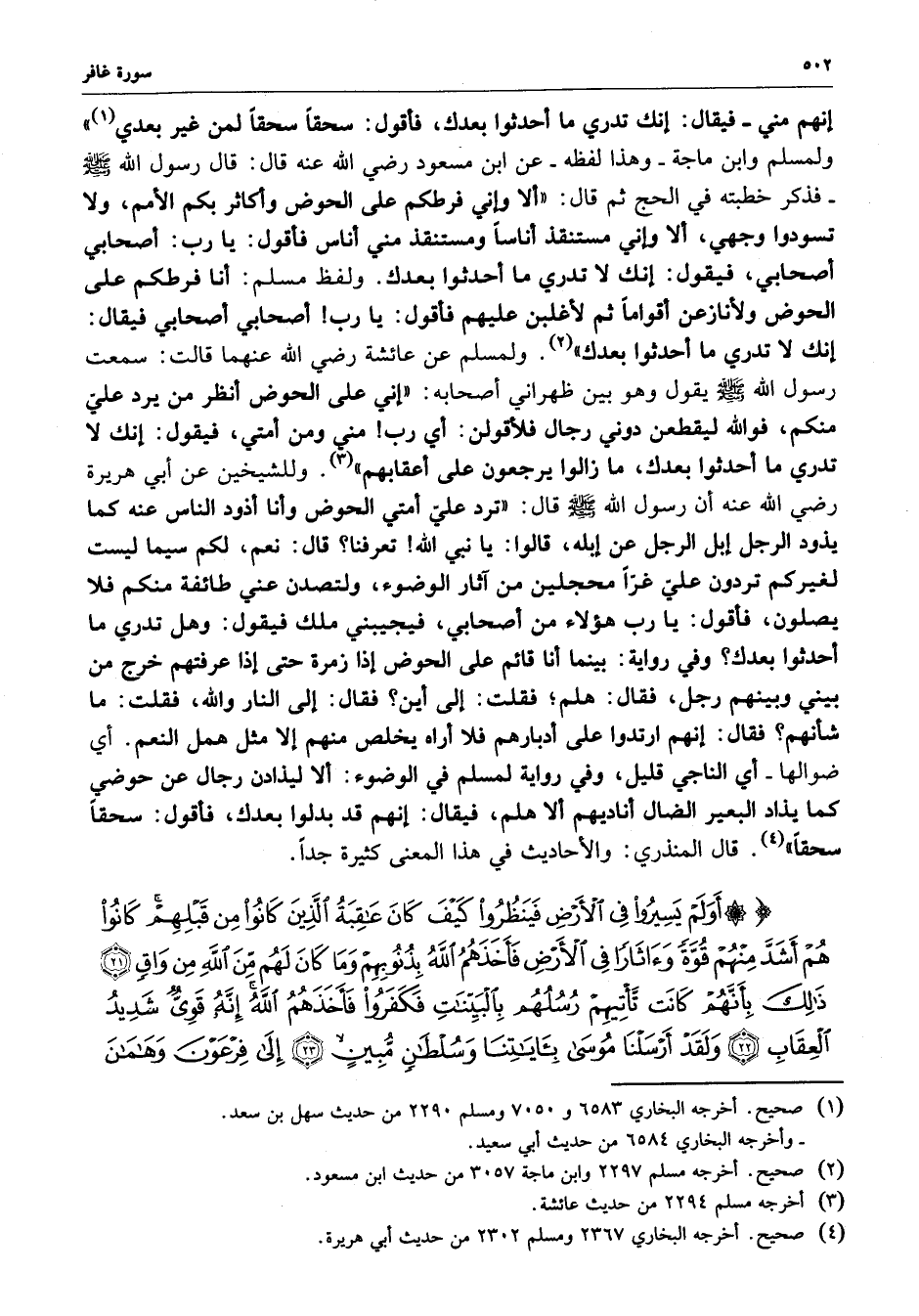 ( إنهم مني - فيقال : إنك لا تدري ما أحدثوا بعدك ، فأقول : سحقاً سحقاً لمن غير بعدي ) ولمسلم وابن ماجه - وهذا لفظه - عن ابن مسعود رضي الله عنه قال : قال رسول الله ( صلى الله عليه وسلم ) - فذكر خطبته في الحج ثم قال : ( إلا وإني فرطكم على الحوض وأكاثر بكم الأمم ، ولا تسودوا وجهي ، ألا وإني مستنفذ أناساً ومستنفذ مني أناس فأقول : يا رب : أصحابي أصحابي ، فيقول : إنك لا تدري ما أحدثوا بعدك ) ولفظ مسلم ( أنا فرطكم على الحوض ولأنازعن أقواماً ثم لأغلبن عليهم فأقول : يا رب أصحابي فيقال : إنك لا تدري ما أحدثوا بعدك ) ولمسلم عن عائشة رضي الله عنهما قالت : سمعت رسول الله ( صلى الله عليه وسلم ) يقول وهو بين ظهراني أصحابه : ( إني على الحوض أنظر من يرد عليّ منكم ، فوالله ليقطعن دوني رجال فلأقولن : أي رب مني ومن أمتي ، فيقول : إنك لا تدري ما أحدثوا بعدك ، ما زالوا يرجعون على أعقابهم ) .