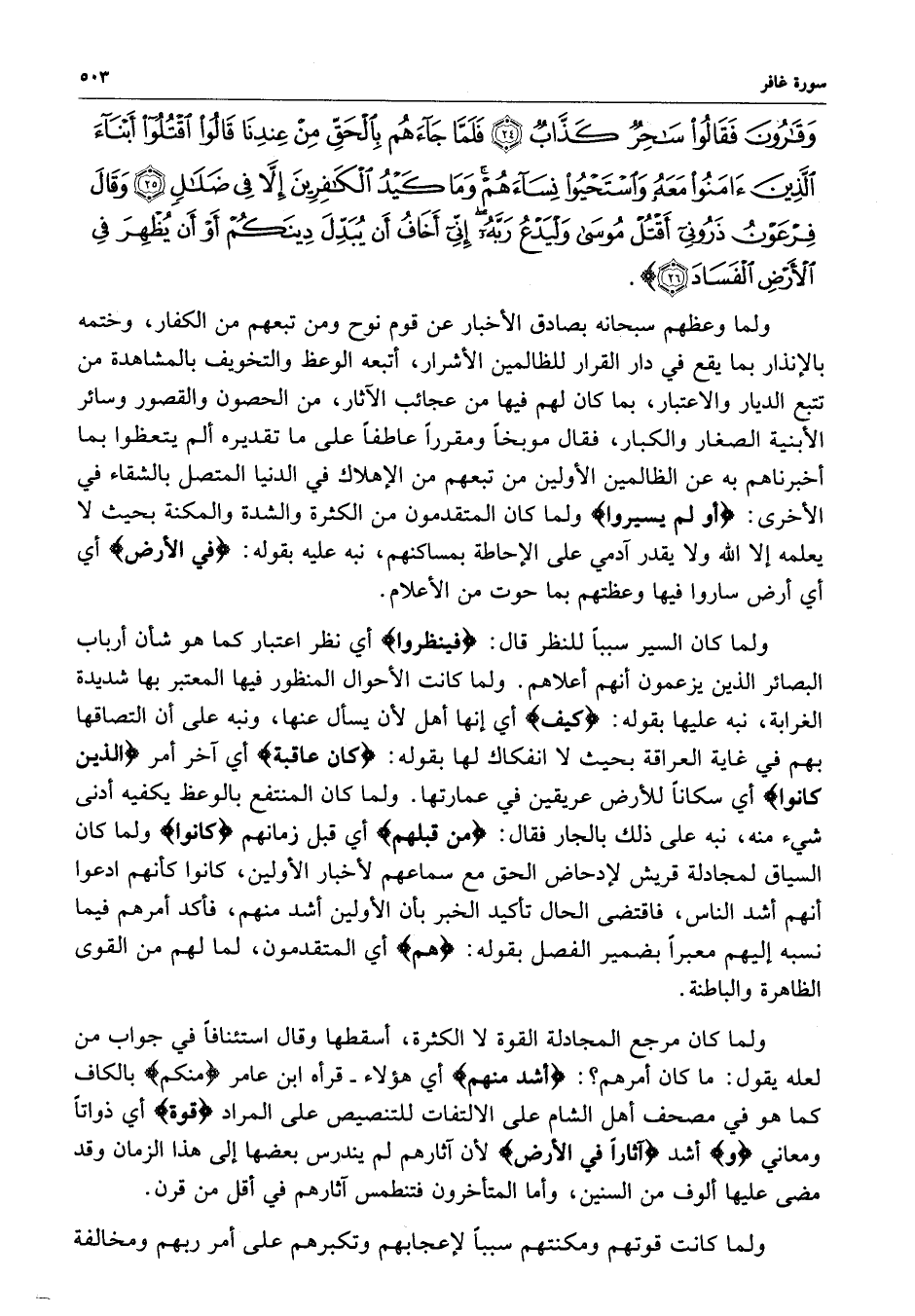 ولما كان مرجع المجادلة القوة لا الكثرة ، وقال استئنافاً في جواب من لعله يقول : ما كان أمرهم ؟ : ( أشد منهم ) أي هؤلاء - قرأه ابن عامر ) منكم ( بالكاف كما هو في مصحف أهل الشام على الالتقاف للتنصيص على المراد ) قوة ) أي ذواتاً ومعاني ) و ( أشد ) آثاراً في الأرض ( لأن آثارهم لم يندرس بعضها إلى هذا الزمان وقد مضى عليها ألوف من السنين ، وأما المتأخرون فتطمس آثارهم في أقل من قرن .