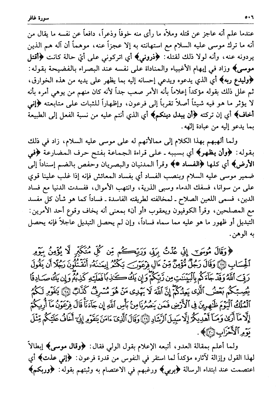 ) وَقَالَ مُوسَى إِنِّي عُذْتُ بِرَبِّي وَرَبِّكُمْ مِّن كُلِّ مُتَكَبِّرٍ لاَّ يُؤْمِنُ بِيَوْمِ الْحِسَابِ وَقَالَ رَجُلٌ مُّؤْمِنٌ مِّنْ آلِ فِرْعَوْنَ يَكْتُمُ إِيمَانَهُ أَتَقْتُلُونَ رَجُلاً أَن يَقُولَ رَبِّيَ اللَّهُ وَقَدْ جَآءَكُمْ بِالْبَيِّنَاتِ مِن رَّبِّكُمْ وَإِن يَكُ كَاذِباً فَعَلَيْهِ كَذِبُهُ وَإِن يَكُ صَادِقاً يُصِبْكُمْ بَعْضُ الَّذِي يَعِدُكُمْ إِنَّ اللَّهَ لاَ يَهْدِي مَنْ هُوَ مُسْرِفٌ كَذَّابٌ يقَومِ لَكُمُ الْمُلْكُ الْيَوْمَ ظَاهِرِينَ فِي الأَرْضِ فَمَن يَنصُرُنَا مِن بَأْسِ اللَّهِ إِن جَآءَنَا قَالَ فِرْعَوْنُ مَآ أُرِيكُمْ إِلاَّ مَآ أَرَى وَمَآ أَهْدِيكُمْ إِلاَّ سَبِيلَ الرَّشَادِ وَقَالَ الَّذِي آمَنَ يقَوْمِ إِنِّي أَخَافُ عَلَيْكُمْ مِّثْلَ يَوْمِ الأَحْزَابِ ( ( )