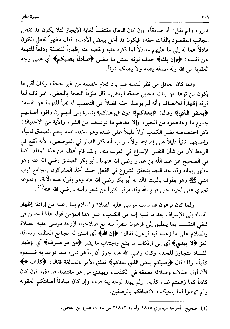 ولما كان العاقل من نظر لنفسه فلم يرد كلام خمصه من غير حجة ، وكان أقل ما يكون من توعد من بانت مخايل صدقه البعض ، قال ملزماً الحجة بالبعض ، غير ناف لما فوقه أظهاراً للأنصاف وأنه لم يوصله حقه فضلاً عن التعصب له نفياً للتهمة عن نفسه : ( بعض الذي ( وقال : ( يعدكم ( دون ( يوعدكم ) إشارة إلى أنهم إن وافوه أصابهم جميع ما وعدهموه من الخير ، وإلا دهاهم ما توعدهم من الشر ، والآية من الاحتباك : ذكر اختصاصه بضر الكذب أولاً دليلاً على ضده وهو اختصاصه بنفع الصدق ثانياً ، وإصابتهم ثانياً دليلاً على إصابته أولاً ، وسره أنه ذكر الضار في الموضعين ، لأنه أنفع في الوعظ لأن من شأن النفس الإسراع في الهرب منه ، ولقد قام أعظم من هذا المقام - كما في الصحيح عن عبد الله بن عمرو رضي الله عنهما - أبو بكر الصديق رضي الله عنه وهو مظهر إيمانه وقد جد الجد بتحقق الشروع في الفعل حيث اخذ المشركون بمجامع ثوب النبي ( صلى الله عليه وسلم ) وهو يطوف بالبيت فالتزمه أبو بكر رضي الله عنه وهو يقول هذه الآية ، ودموعه تجري على لحيته حتى فرج الله وقد مزقوا كثيراً من شعر رأسه - رضي الله عنه .
