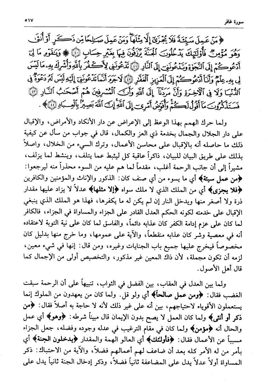 ) مَنْ عَمِلَ سَيِّئَةً فَلاَ يُجْزَى إِلاَّ مِثْلَهَا وَمَنْ عَمِلَ صَالِحاً مِّن ذَكَرٍ أَوْ أُنْثَى وَهُوَ مُؤْمِنٌ فَأُوْلَئِكَ يَدْخُلُونَ الْجَنَّةَ يُرْزَقُونَ فِيهَا بِغَيْرِ حِسَابٍ وَيقَوْمِ مَا لِي أَدْعُوكُمْ إِلَى النَّجَاةِ وَتَدْعُونَنِي إِلَى النَّارِ تَدْعُونَنِي لأَكْفُرَ بِاللَّهِ وَأُشْرِكَ بِهِ مَا لَيْسَ لِي بِهِ عِلْمٌ وَأَنَاْ أَدْعُوكُمْ إِلَى الْعَزِيزِ الْغَفَّارِ لاَ جَرَمَ أَنَّمَا تَدْعُونَنِي إِلَيْهِ لَيْسَ لَهُ دَعْوَةٌ فِي الدُّنْيَا وَلاَ فِي الآخِرَةِ وَأَنَّ مَرَدَّنَآ إِلَى اللَّهِ وَأَنَّ الْمُسْرِفِينَ هُمْ أَصْحَابُ النَّارِ فَسَتَذْكُرُونَ مَآ أَقُولُ لَكُمْ وَأُفَوِّضُ أَمْرِي إِلَى اللَّهِ إِنَّ اللَّهَ بَصِيرٌ بِالْعِبَادِ ( ( )