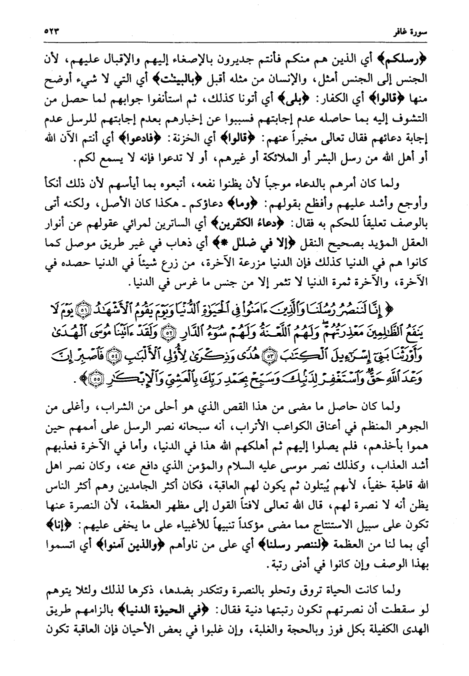 ) إِنَّا لَنَنصُرُ رُسُلَنَا وَالَّذِينَ آمَنُواْ فِي الْحَيَاةِ الدُّنْيَا وَيَوْمَ يَقُومُ الأَشْهَادُ يَوْمَ لاَ يَنفَعُ الظَّالِمِينَ مَعْذِرَتُهُمْ وَلَهُمُ الْلَّعْنَةُ وَلَهُمْ سُوءُ الدَّارِ وَلَقَدْ آتَيْنَا مُوسَى الْهُدَى وَأَوْرَثْنَا بَنِي إِسْرَائِيلَ الْكِتَابَ هُدًى وَذِكْرَى لأُوْلِي الأَلْبَابِ فَاصْبِرْ إِنَّ وَعْدَ اللَّهِ حَقٌّ وَاسْتَغْفِرْ لِذَنبِكَ وَسَبِّحْ بِحَمْدِ رَبِّكَ بِالْعَشِيِّ وَالإِبْكَارِ ( ( )