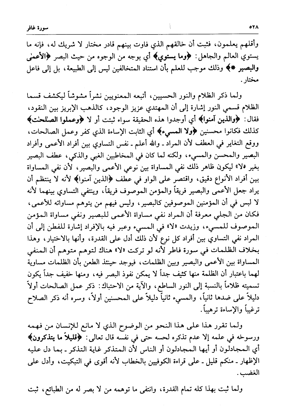 ولما ذكر الظلام والنور الحسيين ، أتبعه المعنويين نشراً ليكشف قسما الظلام قسمي النور إشارة إلى أن المهتدي عزيز الوجود ، كالذهب الإبريز بين النقود ، فقال : ( والذين آمنوا ) أي أوجدوا هذه الحقيقة ثبتت أو لا ) وعملوا الصالحات ( كذلك فكانوا محسنين ) ولا المسيء ) أي الثابت الإساءة الذي كفر وعمل الصالحات ، ووقع التغاير في العطف لأن المراد - والله أعلم - نفس التساوي بين أفراد الأعمى وأفراد البصير والمحسن والمسيء ، ولكنه لما كان في المخاطبين الغبي والذكي ، عطف البصير بغير ( لا ) ليكون ظاهر ذلك نفي المساواة بين نوعي الأعمى والبصير ، لأن نفي المساواة بين أفراد الأنواع دقيق ، واقتصر على الواو في عطف ) الذين آمنو ( لأنه لا ينتظم أن يراد جعل الأعمى والبصير فريقاً والمؤمن الموصوف فريقاً ، وينتفي التساوي بينهما لأنه لا لبس في أن المؤمنين الموصوفين كالبصير ، وليس فيهم من يتوهم مساواته للأعمى ، فكان من الجلي معرفة أن المراد نفسي مساواة الأعمى للبصير ونفي مساواة المؤمن الموصوف للمسيء ، وزيدت ( لا ) في المسيء وعبر فيه بالإفراد إشارة للفطن إلى أن المراد نفي التساوي بين أفراد كل نوع لأن ذلك أدل على القدرة ، وأنها بالاختيار ، وهذا بخلاف الظلمات في سورة فاطر لأنه لو تركت ( لا ) هناك لتوهم متوهم أن المنفي المساواة بين الأعمى والبصير وبين الظلمات ، فيوجد حينئذ الطعن بأن الظلمات مساوية لهما باعتبار أن الظلمة منها كثيف جداً لا يمكن نفوذ البصر فيه ، ومنها خفيف جداً يكون تسميته ظلاماً بالنسبة إلى النور الساطع ، والآية من الاحتباك : ذكر عمل الصالحات أولاً دليلاً على ضدها ثانياً ، والمسيء ثانياً دليلاً على المحسنين أولاً ، وسره أنه ذكر الصلاح ترغيباً والإساءة ترهيباً .
