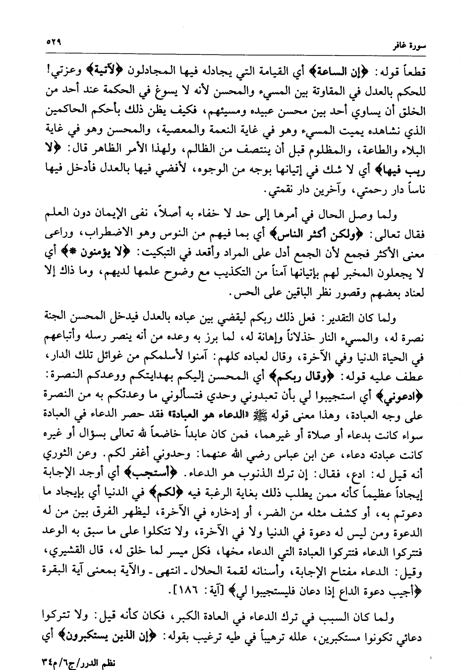 قطعاً قوله : ( إن الساعة ) أي القيامة التي يجادله فيها المجادلون ) لآتية ( وعزتي للحكم بالعدل في المقارنة بين المسيء والمحسن لأنه لا يسوغ في الحكمة عند أحد من الخلق أن يساوي أحد بين محسن عبيده ومسيئهم ، فكيف يظن ذلك بأحكم الحاكمين الذي نشاهده يميت المسيء وهو في غاية النعمة والمعصية ، والمحسن وهو في غاية البلاء والطاعة ، والمظلوم قبل أن ينتصف من الظالم ، ولهذا الأمر الظاهر قال : ( لا ريب فيها ) أي لا شك في إيتانها بوجه من الوجوه ، لأفضي فيها بالعدل فأدخل فيها ناساً دار رحمتي ، وآخرين نقمتي .