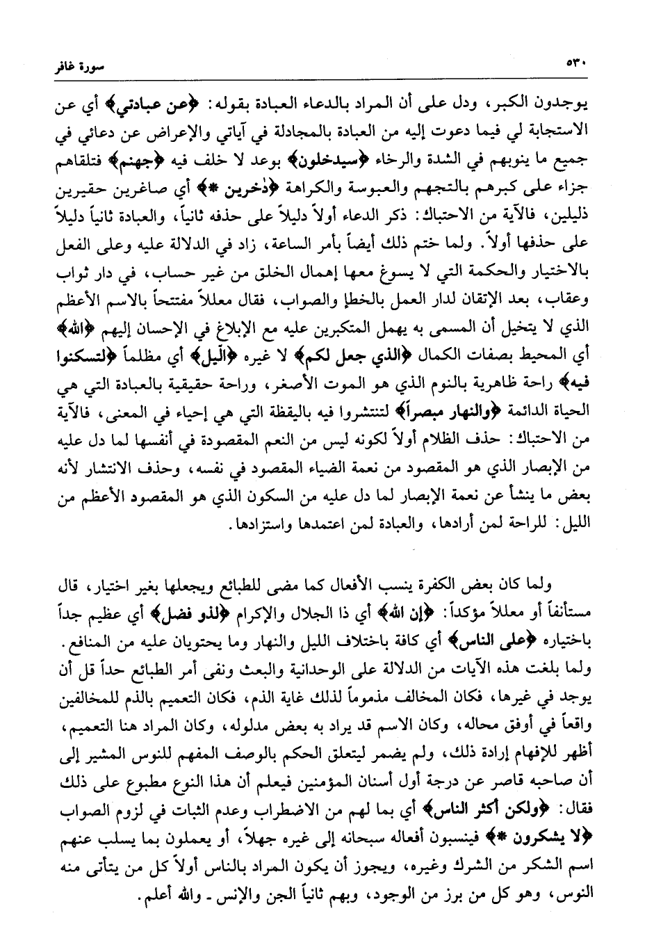 ولما ختم ذلك أيضاً بأمر الساعة ، زاد في الدلالة عليه وعلى الفعل بالاختيار والحكمة التي لا يسوغ معها إهمال الخلق من غير حساب ، في دار ثواب وعقاب ، بعد الإتقان لدار العمل بالخطإ والصواب ، فقال معللاً مفتتحاً بالاسم الأعظم الذي لا يتخيل أن المسمى به يهمل المتكبرين عيله مع الإبلاغ في الإحسان إليهم ) الله ) أي المحيط بصفات الكمال ) الذي جعل لكم ( لا غيره ) الّيل ) أي مظلماً ) لتسكنوا فيه ( راحة ظاهرية بالنوم الذي هو الموت الأصغر ، وراحة حقيقية بالعبادة التي هي الحياة الدائمة ) والنهار مبصراً ( لتنتشروا فيه باليقظة التي هي إحياء في المعنى ، فالآية من الاحتباك : حذف الظلام أولاً لكونه ليس من النعم المقصودة في أنفسها لما دل عليه من الإبصار الذي هو المقصود من نعمة الضياء المقصود في نفسه ، وحذف الانتشار لأنه بعض ما ينشأ عن نعمة الإبصار لما دل عليه من السكون الذي هو المقصود الأعظم من الليل : للراحة لما أرادها ، لما اعتمدها واستزادها .