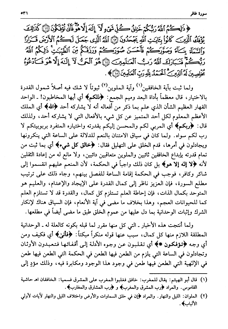 ) ذَلِكُمُ اللَّهُ رَبُّكُمْ خَالِقُ كُلِّ شَيْءٍ لاَّ إِلَهَ إِلاَّ هُوَ فَأَنَّى تُؤْفَكُونَ كَذَلِكَ يُؤْفَكُ الَّذِينَ كَانُواْ بِآيَاتِ اللَّهِ يَجْحَدُونَ اللَّهُ الَّذِي جَعَلَ لَكُمُ الأَرْضَ قَرَاراً وَالسَّمَآءَ بِنَآءً وَصَوَّرَكُمْ فَأَحْسَنَ صُوَرَكُمْ وَرَزَقَكُمْ مِّنَ الطَّيِّبَاتِ ذَلِكُمُ اللَّهُ رَبُّكُمْ فَتَبَارَكَ اللَّهُ رَبُّ الْعَالَمِينَ هُوَ الْحَيُّ لاَ إِلَهَ إِلاَّ هُوَ فَادْعُوهُ مُخْلِصِينَ لَهُ الدِّينَ الْحَمْدُ للَّهِ رَبِّ الْعَالَمِينَ ( ( )