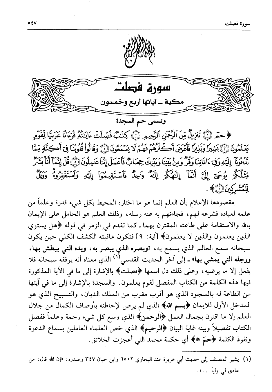 ) حم تَنزِيلٌ مِّنَ الرَّحْمَنِ الرَّحِيمِ كِتَابٌ فُصِّلَتْ آيَاتُهُ قُرْآناً عَرَبِيّاً لِّقَوْمٍ يَعْلَمُونَ بَشِيراً وَنَذِيراً فَأَعْرَضَ أَكْثَرُهُمْ فَهُمْ لاَ يَسْمَعُونَ وَقَالُواْ قُلُوبُنَا فِي أَكِنَّةٍ مِمَّا تَدْعُونَا إِلَيْهِ وَفِي آذانِنَا وَقْرٌ وَمِن بَيْنِنَا وَبَيْنِكَ حِجَابٌ فَاعْمَلْ إِنَّنَا عَامِلُونَ قُلْ إِنَّمَآ أَنَاْ بَشَرٌ مِّثْلُكُمْ يُوحَى إِلَيَّ أَنَّمَآ إِلَهُكُمْ إِلَهٌ وَاحِدٌ فَاسْتَقِيمُواْ إِلَيْهِ وَاسْتَغْفِرُوهُ وَوَيْلٌ لِّلْمُشْرِكِينَ ( ( )