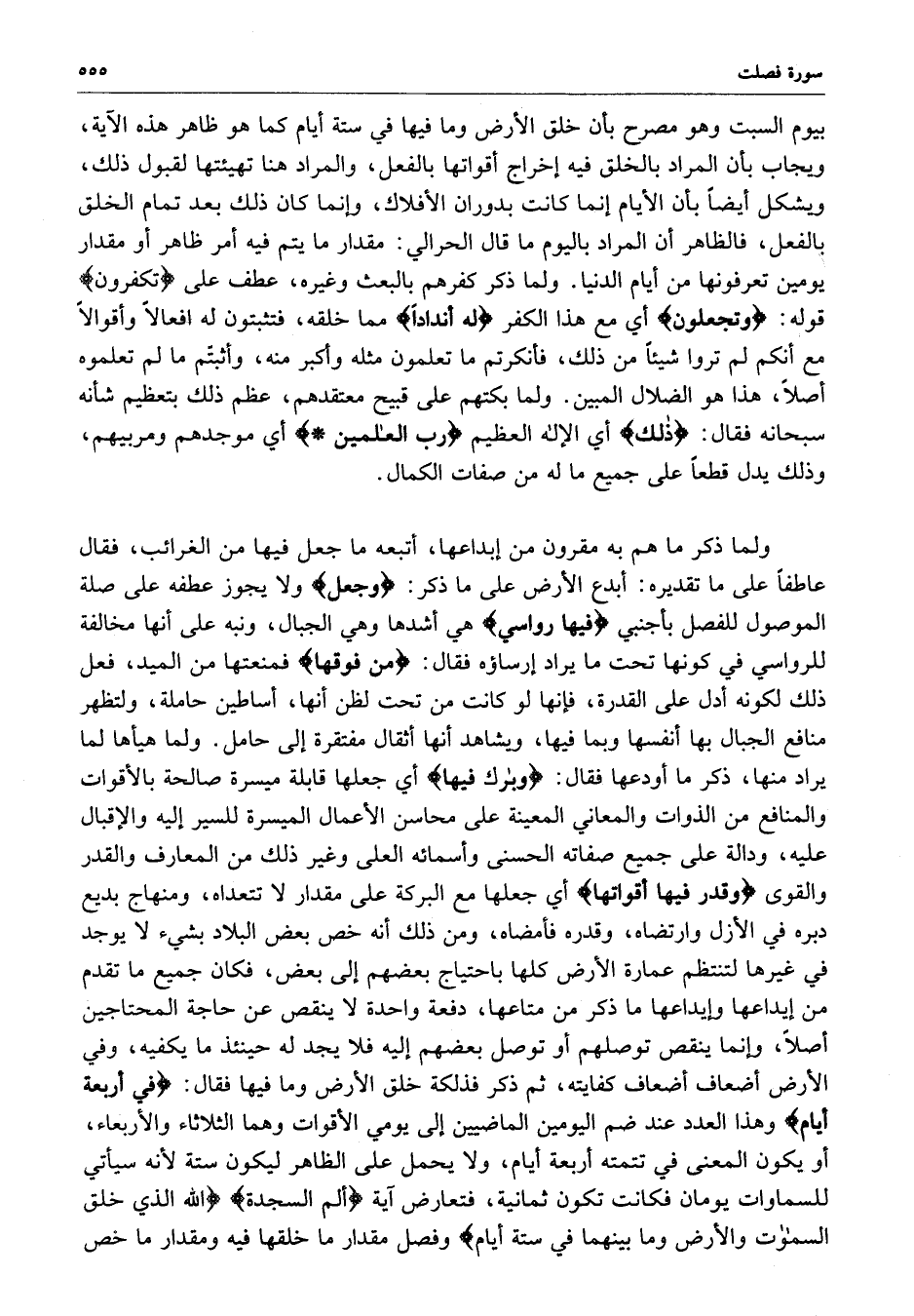 ولما هيأها لما يراد منها ، ذكر ما أودعها فقال : ( وبارك فيها ) أي جعلها قابلة ميسرة للسير إليه والإقبال عليه ، ودالة على جميع صفاته الحسنى وأسمائه العلى وغير ذلك من المعارف والقدر والقوى ) وقدر فيها أقواتها ) أي جعلها مع البركة على مقدار لا تتعداه ، منهاج بديع دبره في الأزل وارتضاه ، وقدره فأمضاه ، ومن ذلك أنه خص بعض البلاد بشيء لا يوجد في غيرها لتنظيم عمارة الأرض كلها باحتياج بعضهم إلى بعض ، فكان جميع ما تقدم من إيداعها وإيداعها ما ذكر من متاعها ، دفعة واحدة لا ينقص عن حاجة المحتاجين أصلاً ، وإنما ينقص توصلهم أو توصل بعضهم إليه فلا يجد له حينئذ ما يكفيه ، وفي الأرض أضعاف كفايته ، ثم ذكر فذلكة خلق الأرض وما فيها فقال : ( في أربعة أيام ( وهذا العدد عن ضم اليومين الماضيين إلى يومي الأقوات وهما الثلاثاء والأربعاء ، أو يكون المعنى في تتمته أربعة أيام ، ولا يحمل على الظاهر ليكون ستة لأنه سيأتي للسماوات يومان فكانت تكون ثمانية ، فتعارض آية ) ألم السجدة ( ) لله الذي خلق السماوات والأرض وما بينهما في ستة أيام ( وفصل مقدار ما خلقها فيه ومقدار ما خص