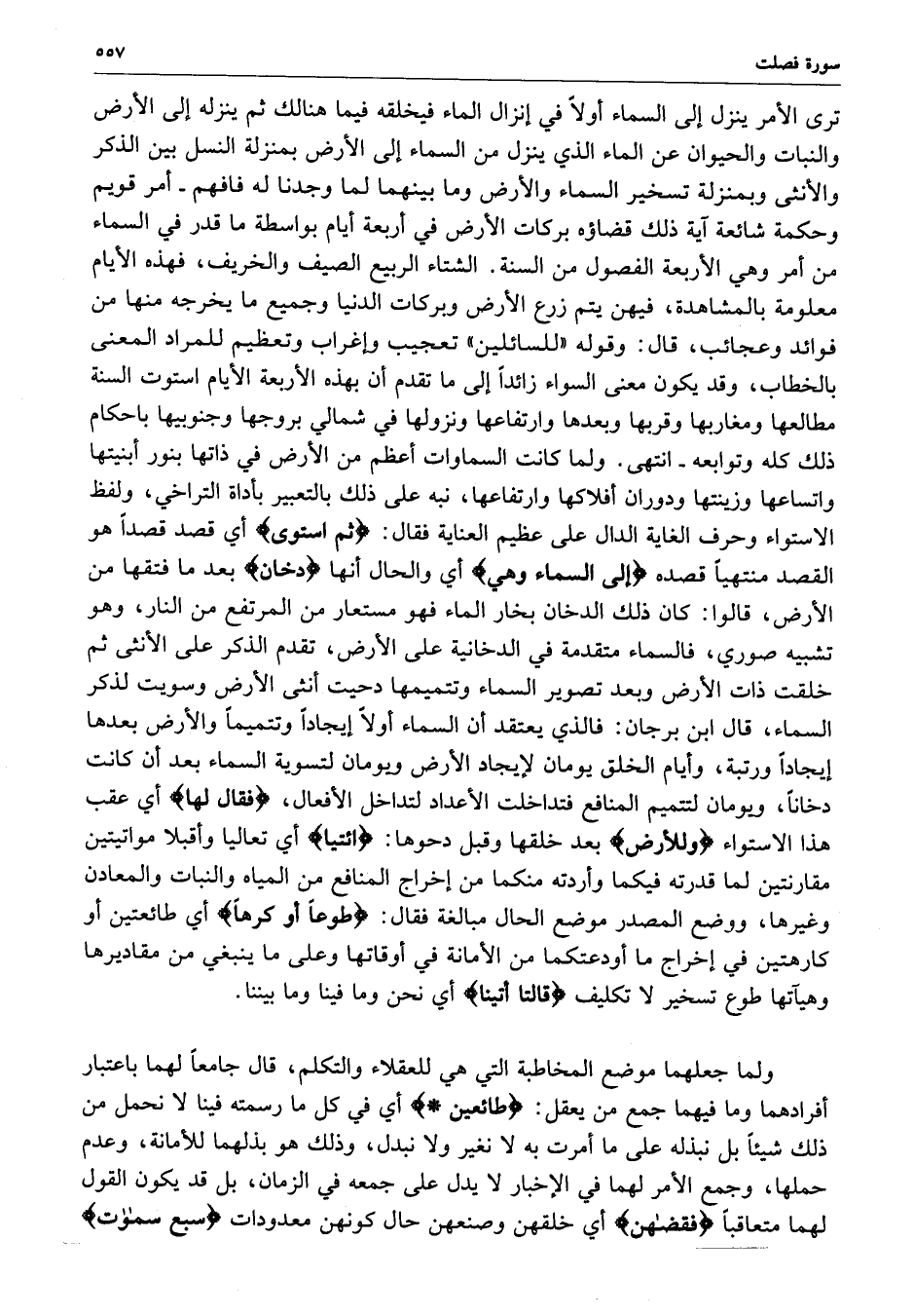 ترى الأمر إلى السماء أولاً في إنزال الماء فيخلقه فيما هنالك ثم ينزله إلى الأرض والنبات والحيوان عن الماء الذي ينزل من السماء إلى الأرض بمنزلة النسل بين الذكر والأنثى وبمنزلة تسخير السماء والأرض وما بينهما لما وجدنا له فافهم - أمر قويم وحكمة شائعة آية قضاؤه بركات الأرض في أربعة أيام بواسطة ما قدر في السماء من أمر وهي الأربعة الفصول من السنة .