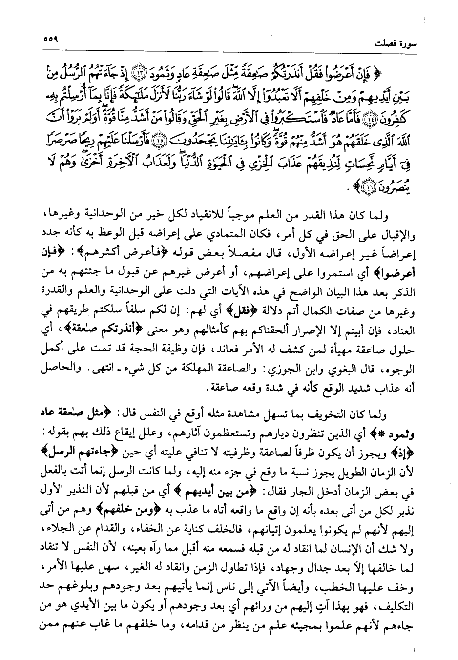 ) فَإِنْ أَعْرَضُواْ فَقُلْ أَنذَرْتُكُمْ صَاعِقَةً مِّثْلَ صَاعِقَةِ عَادٍ وَثَمُودَ إِذْ جَآءَتْهُمُ الرُّسُلُ مِن بَيْنِ أَيْدِيهِمْ وَمِنْ خَلْفِهِمْ أَلاَّ تَعْبُدُواْ إِلاَّ اللَّهَ قَالُواْ لَوْ شَآءَ رَبُّنَا لأَنزَلَ مَلاَئِكَةً فَإِنَّا بِمَآ أُرْسِلْتُمْ بِهِ كَافِرُونَ فَأَمَّا عَادٌ فَاسْتَكْبَرُواْ فِي الأَرْضِ بِغَيْرِ الْحَقِّ وَقَالُواْ مَنْ أَشَدُّ مِنَّا قُوَّةً أَوَلَمْ يَرَوْاْ أَنَّ اللَّهَ الَّذِي خَلَقَهُمْ هُوَ أَشَدُّ مِنْهُمْ قُوَّةً وَكَانُواْ بِآيَاتِنَا يَجْحَدُونَ فَأَرْسَلْنَا عَلَيْهِمْ رِيحاً صَرْصَراً فِي أَيَّامٍ نَّحِسَاتٍ لِّنُذِيقَهُمْ عَذَابَ الْخِزْيِ فِي الْحَيَاةِ الدُّنْيَا وَلَعَذَابُ الآخِرَةِ أَخْزَى وَهُمْ لاَ يُنصَرُونَ ( ( )