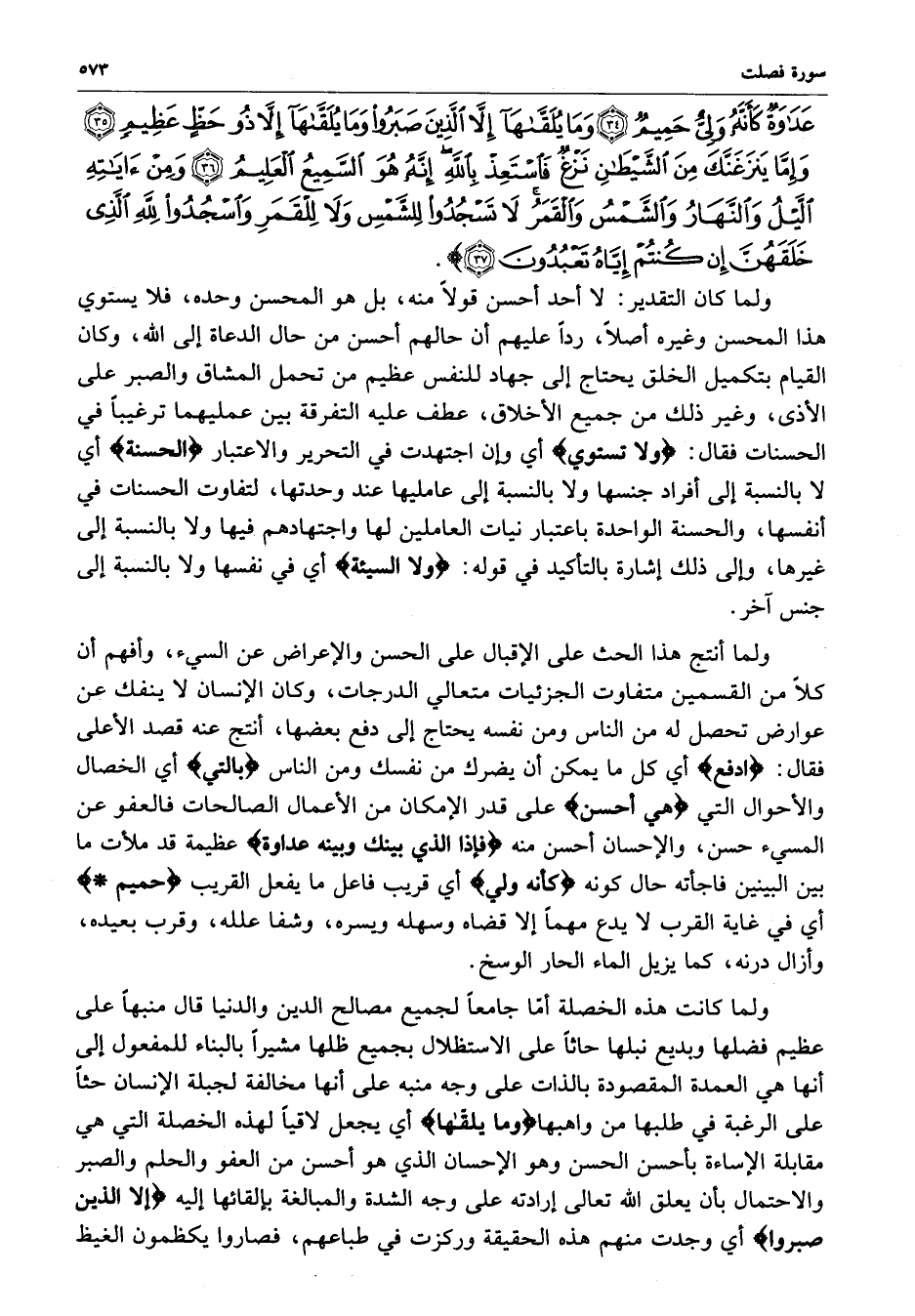 عَدَاوَةٌ كَأَنَّهُ وَلِيٌّ حَمِيمٌ وَمَا يُلَقَّاهَا إِلاَّ الَّذِينَ صَبَرُواْ وَمَا يُلَقَّاهَآ إِلاَّ ذُو حَظٍّ عَظِيمٍ وَإِمَّا يَنزَغَنَّكَ مِنَ الشَّيْطَانِ نَزْغٌ فَاسْتَعِذْ بِاللَّهِ إِنَّهُ هُوَ السَّمِيعُ الْعَلِيمُ وَمِنْ آيَاتِهِ اللَّيْلُ وَالنَّهَارُ وَالشَّمْسُ وَالْقَمَرُ لاَ تَسْجُدُواْ لِلشَّمْسِ وَلاَ لِلْقَمَرِ وَاسْجُدُواْ لِلَّهِ الَّذِي خَلَقَهُنَّ إِن كُنتُمْ إِيَّاهُ تَعْبُدُونَ ) 73