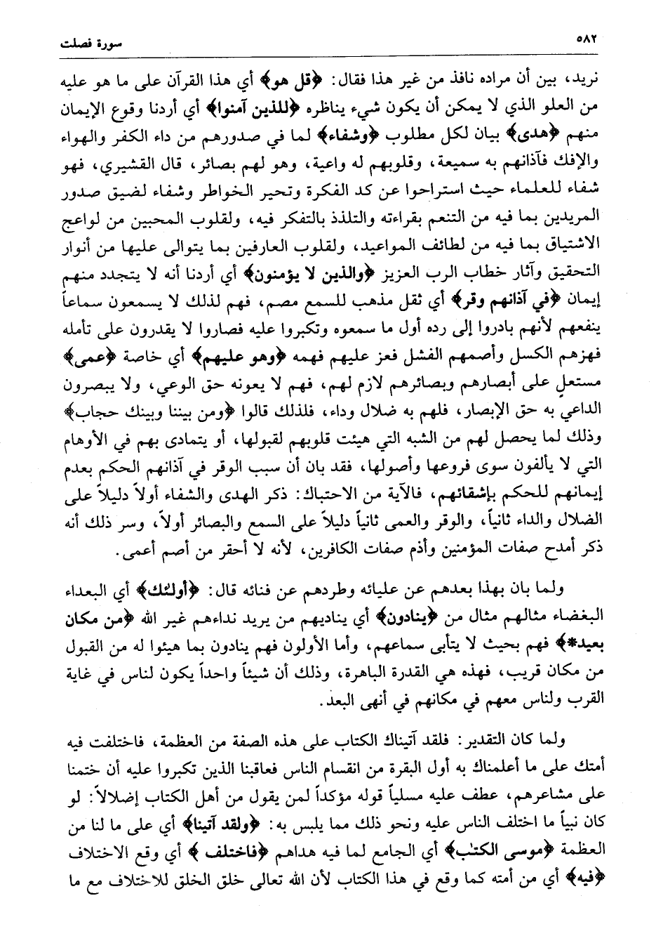 نريد ، بين أن مراده نافذ من غير هذا فقال : ( قل هو ) أي هذا القرآن على ما هو عليه من العلو الذي لا يمكن أن يكون شيء يناظره ) للذين آمنوا ) أي أردنا وقوع الإيمان منهم ) هدى ( بيان لكل مطلوب ) شفاء ( لما في صدروهم من داء الكفر والهواء شفاء للعلماء حيث استراحوا من كد الفكرة وتحير الخواطر وشفاء لضيق صدور المريدين بما فيه من التنعيم بقراءته والتلذذ بالتفكر فيه ، ولقلوب المحبين من لواعج الاشتياق بما فيه من لطائف المواعيد ، ولقلوب العارفين بما يتوالى عليها من أنوار التحقيق وآثار خطاب الرب العزيز ) والذين لا يؤمنون ) أي أردنا أنه لا يتجدد منهم إيمان ) في آذانهم وقر ) أي ثقل مذهب للسمع مصم ، فهم لذلك لا يسمعون سماعاً ينفعهم لأنهم بادروا إلى رده أول ما سمعوه وتكبروا عليه فصاروا لا يقدرون على تأمله فهزهم الكسل وأصمهم الفشل فعو عليهم فهمه ) وهو عليهم ) أي خاصة ) عمى ( مستعلٍ على أبصارهم وبصائرهم لازم لهم ، فهم لا يعونه حق الوعي ، ولا يبصرون الداعي به حق الإبصار ، فلهم به ضلال وداء ، فلذلك قالوا ) ومن بيننا وبينك حجاب ( وذلك لما يحصل لهم من الشبه التي هيئت قلوبهم لقبولها ، أو يتمادى بهم في الأوهام التي لا يألفون سوى فروعها وأصولها ، فقد بان لأن سبب الوقر في آذانهم الحكم بعدم إيمانهم للحكم بإشقائهم ، فالآية من الاحتباك : ذكر الهدى والشفاء اولاً دليلاً على الضلال والداء ثانياً ، والوقر والعمى ثانياً دليلاً على السمع والبصائر أولاً ، وسر ذلك أنه ذكر أمدح صفات المؤمنين وأذم صفات الكافرين ، لأنه لا أحقر من أصم أعمى .