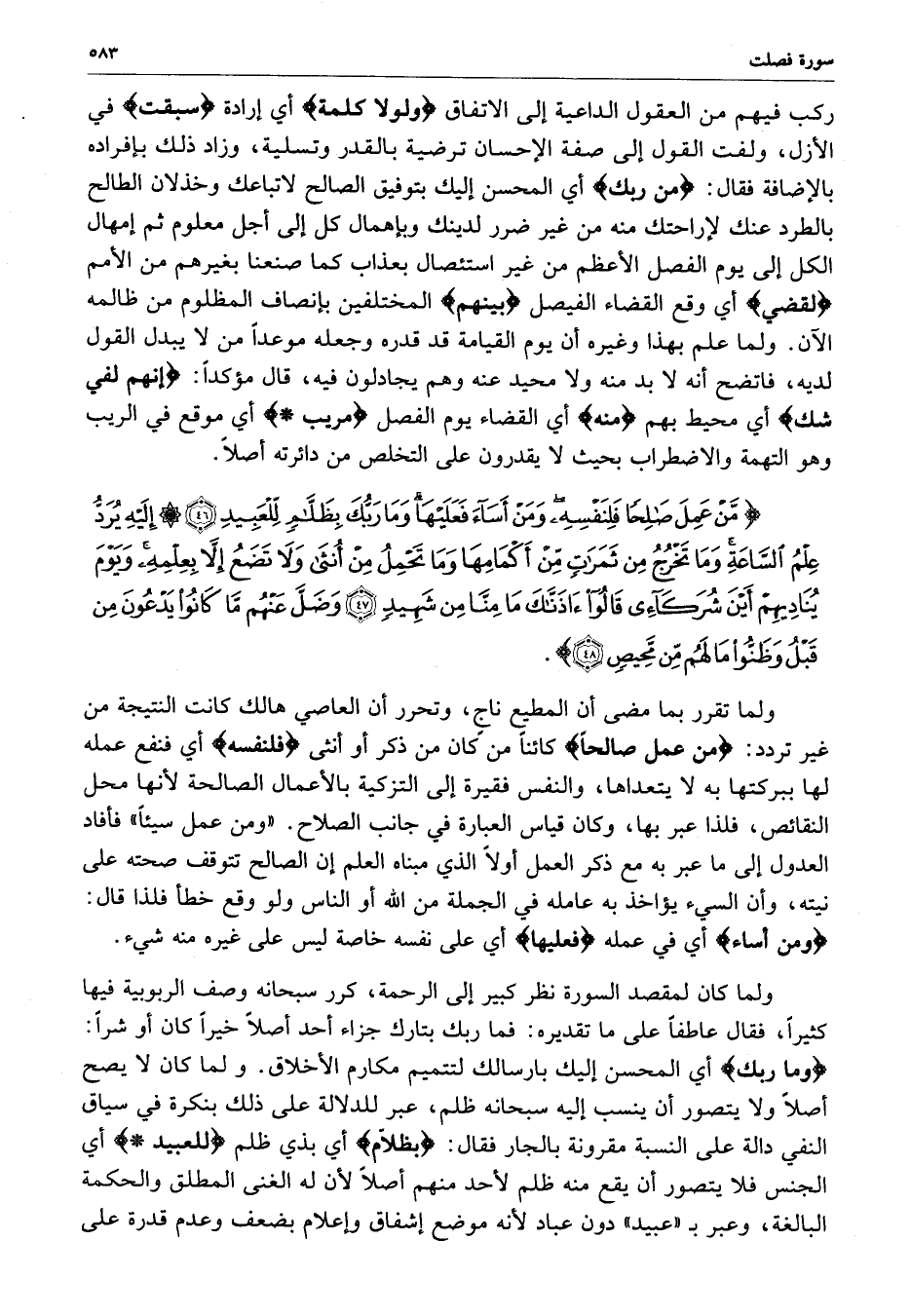 ) مَّنْ عَمِلَ صَالِحاً فَلِنَفْسِهِ وَمَنْ أَسَآءَ فَعَلَيْهَا وَمَا رَبُّكَ بِظَلاَّمٍ لِّلْعَبِيدِ إِلَيْهِ يُرَدُّ عِلْمُ السَّاعَةِ وَمَا تَخْرُجُ مِن ثَمَرَاتٍ مِّنْ أَكْمَامِهَا وَمَا تَحْمِلُ مِنْ أُنْثَى وَلاَ تَضَعُ إِلاَّ بِعِلْمِهِ وَيَوْمَ يُنَادِيهِمْ أَيْنَ شُرَكَآئِي قَالُواْ آذَنَّاكَ مَا مِنَّا مِن شَهِيدٍ وَضَلَّ عَنْهُم مَّا كَانُواْ يَدْعُونَ مِن قَبْلُ وَظَنُّواْ مَا لَهُمْ مِّن مَّحِيصٍ ( ( )