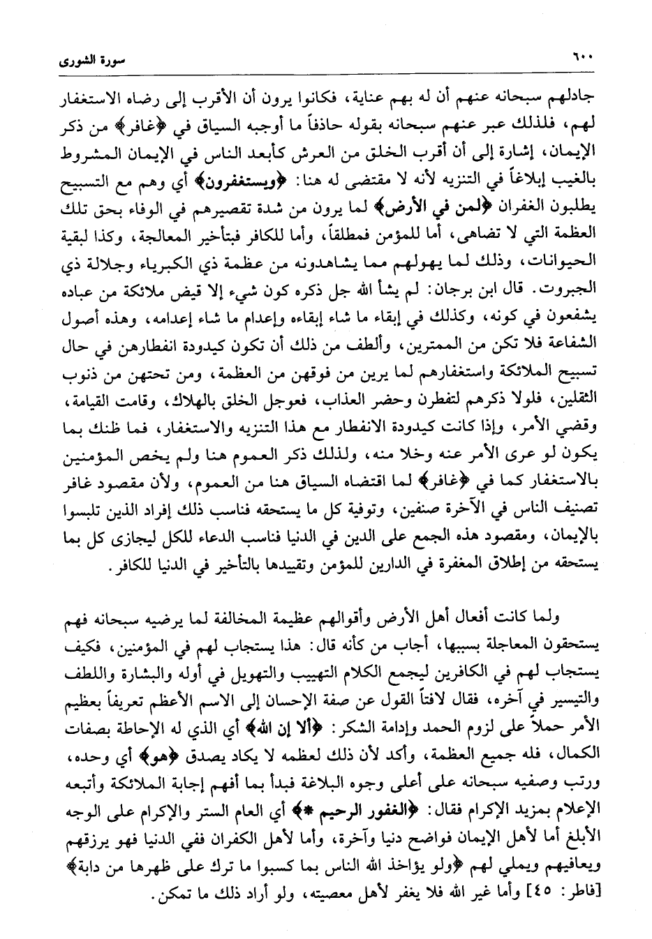 قال ابن برجان : لم يشأ الله جل ذكره كون ضيء إلا قيض ملائكة من عباده يشفعون في كونه ، وكذلك في إبقاء ما شاء إبقاءه وإعدام ما شاء إعدامه ، وهذه أصول الشفاعة فلا تكن من الممترين ، وألطف من ذلك أن تكون كيدودة انفطارهن في حال تسبيح الملائكة واستغفارهم لما يرين من فوقهن من العظمة ، ومن تحتهن من ذنوب الثقلين ، فلولا ذكرهم لتفطرن وحضر العذاب ، فعوجل الخلق بالهلاك ، وقامت القيامة ، وقضيا الأمر ، وإذا كانت كيدودة الانفطار مع هذا التنزيه والاستغفار ، فما ظنك بما يكون لو عرى الأمر عنه وخلا منه ، ولذلك ذكر العموم هنا ولم يخص المؤمنين بالاستغفار كما في ) غافر ( لما اقتضاه السياق هنا من العموم ، ولأن مقصود غافر تصنيف الناس في الآخرة هذه الجمع على الدين في الدنيا فناسب ذلك إفراد الذين تلبسوا بالإيمان ، ومقصود هذه الجمع على الدين في الدنيا فناسب الدعاء للكل ليجازي كل بما يستحقه من إطلاق المغفرة في الدارين للمؤمن وتقييدها بالتأخير في الدنيا للكافر .