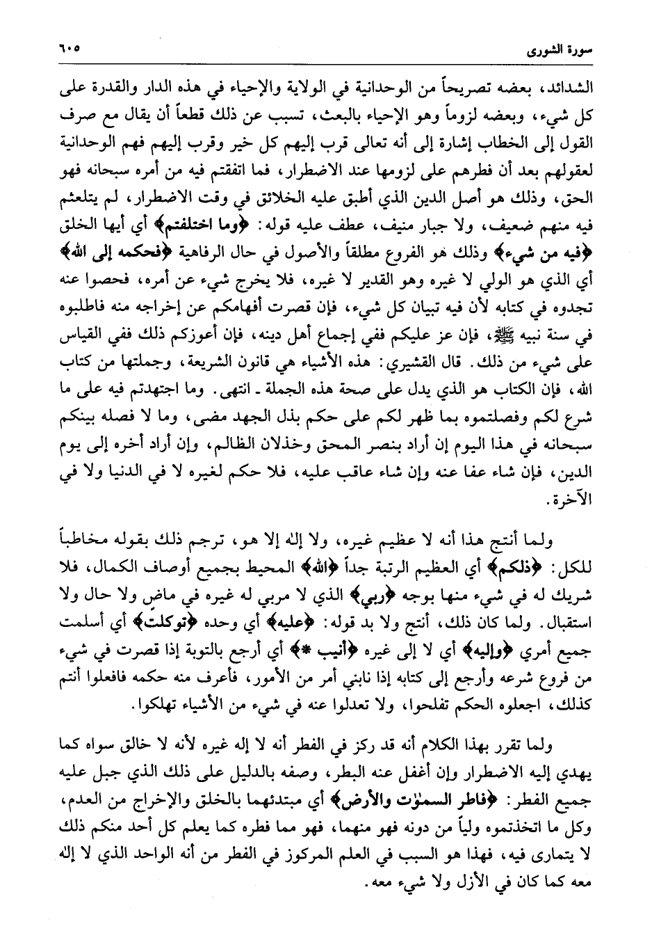 الشدائد ، بعضه تصريحاً من الوحدانية في الولاية والإحياء في هذه الدار والقدرة على كل شيء ، وبعضه تصريحاً من الوحدانية في الولاية والإحياء في هذه الدار والقدرة على كل شيء ، وبعضه لزوماً وهو الإحياء بالبعث ، تسبب عن ذلك قطعاً أن بقال مع صرف القول إلى الخطاب إشارة إلى أنه تعالى قريب إليهم كل خير وقرب إليهم فهم الوحدانية لعقولهم بعد أن فطرهم على لزومها عند الاضطرار ، فما اتفقتم فيه من أمره سبحانه فهو الحق ، وذلك هو أصل الدين الذي أطبق عليه الخلائق في وقت الاضطرار ، لم يتلعثم فيه منهم ضعيف ، ولا جبار منيف ، عطف عليه قوله : ( وما اختلفتم ) أي أيها الخلق ) فيه من شيء ( وذلك هو الفروع مطلقاً والأصول في حال الرفاهية ) فحكمه إلى الله ) أي الذي هو الولي لا غيره وهو القدير لا غيره ، فلا يخرج شيء عن أمره ، فحصوا عنه تجدوه في كتابه لأنه فيه تبيان كل شيء ، فإن قصرت أفهامكم عن إخراجه منه فاطلبوه في سنة نبيه ( صلى الله عليه وسلم ) ، فإن عز عليكم ففي إجماع أهل دينه ، فإن أعوزكم ذلك فقي القياس على شيء من ذلك .