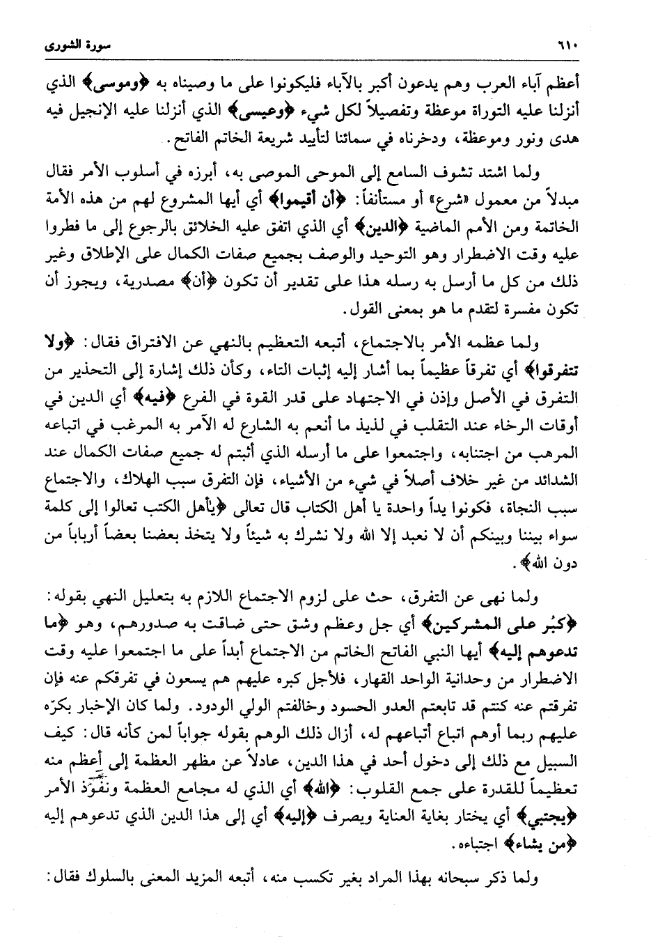 ولما عظمه الأمر بالاجتماع ، أتبعه التعظيم بالنهي عن الافتراق فقال : ( ولا تتفرقوا ) أي تفرقاً عظيماً بما أشار إليه إثبات التاء ، وكأن ذلك إشارة إلى التحذير من التفرق في الأصل وإذن في الاجتهاد على قدر في الفرع ) فيه ) أي الدين في أوقات الرخاء عند التقلب في لذيذ ما أنعم به الشارع له الآمر به المرغب في اتباعه المرهب من اجتنابه ، واجتمعوا على ما أرسله الذي أثبتم له جميع صفات الكمال عند الشدائد من غير خلاف أصلاً في شيء من الأشياء ، فإن التفرق سبب الهلاك ، والاجتماع سبب النداة ، فكونوا يداً واحدة يا أهل الكتاب قال تعالى ) يا أهل الكتاب تعالوا إلى كلمة سواء بيننا وبينكم أن لا نعبد الله ولا نشرك به شيئاً ولا يتخذ بعضنا بعضاً أرباباً من دون الله ( .