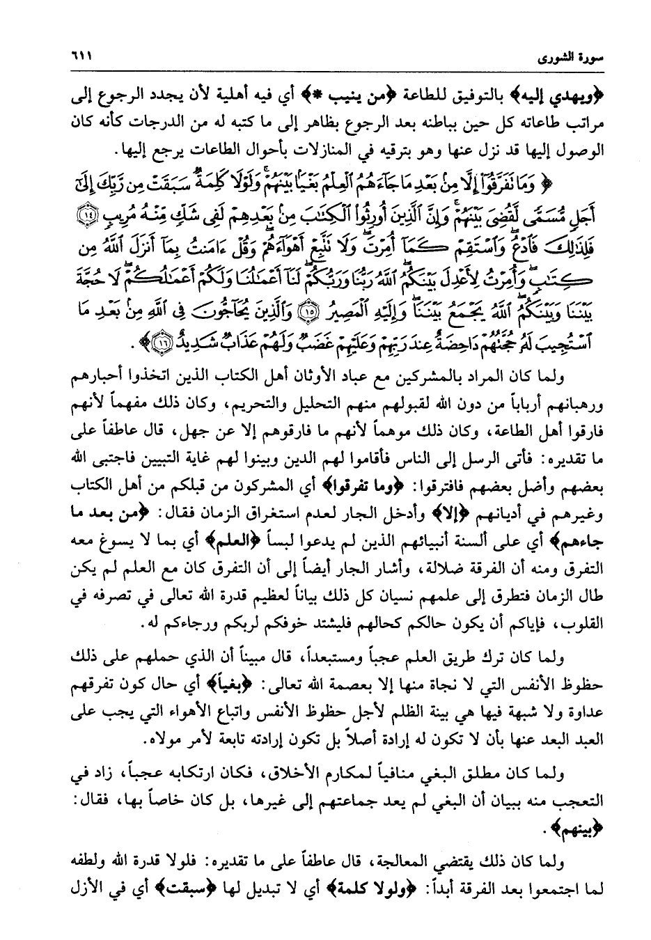 ) وَمَا تَفَرَّقُواْ إِلاَّ مِن بَعْدِ مَا جَآءَهُمُ الْعِلْمُ بَغْياً بَيْنَهُمْ وَلَوْلاَ كَلِمَةٌ سَبَقَتْ مِن رَّبِّكَ إِلَى أَجَلٍ مُّسَمًّى لَّقُضِيَ بِيْنَهُمْ وَإِنَّ الَّذِينَ أُورِثُواْ الْكِتَابَ مِن بَعْدِهِمْ لَفِي شَكٍّ مِّنْهُ مُرِيبٍ فَلِذَلِكَ فَادْعُ وَاسْتَقِمْ كَمَآ أُمِرْتَ وَلاَ تَتَّبِعْ أَهْوَآءَهُمْ وَقُلْ آمَنتُ بِمَآ أَنزَلَ اللَّهُ مِن كِتَابٍ وَأُمِرْتُ لأَعْدِلَ بَيْنَكُمُ اللَّهُ رَبُّنَا وَرَبُّكُمْ لَنَآ أَعْمَالُنَا وَلَكُمْ أَعْمَالُكُمْ لاَ حُجَّةَ بَيْنَنَا وَبَيْنَكُمُ اللَّهُ يَجْمَعُ بَيْنَنَا وَإِلَيْهِ الْمَصِيرُ وَالَّذِينَ يُحَآجُّونَ فِي اللَّهِ مِن بَعْدِ مَا اسَتُجِيبَ لَهُ حُجَّتُهُمْ دَاحِضَةٌ عِندَ رَبِّهِمْ وَعَلَيْهِمْ غَضَبٌ وَلَهُمْ عَذَابٌ شَدِيدٌ ( ( )
