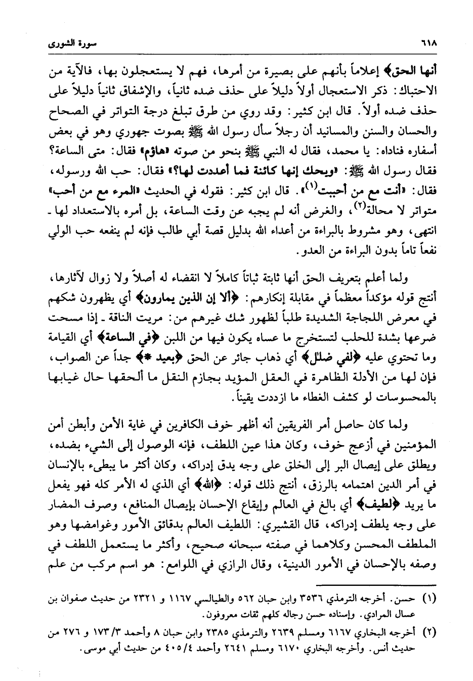 قال ابن كثير : وقد روي من طرق تبلغ درجة التواتر في الصحاح والحسان والسنن والمسانيد أن رجلاً سأل رسول الله ( صلى الله عليه وسلم ) بصوت جهوري وهو في بعض أسفاره فناداه : يا محمد ، فقال له النبي ( صلى الله عليه وسلم ) بنحو من صوته ( هاؤم ) فقال : متى الساعة ؟ فقال رسول الله صلى الله عليه : ( ويحك أنها كائنة فما أعددت لها ؟ ) فقال : حب الله ورسوله ، فقال : ( أنت مع من أحببت ) .