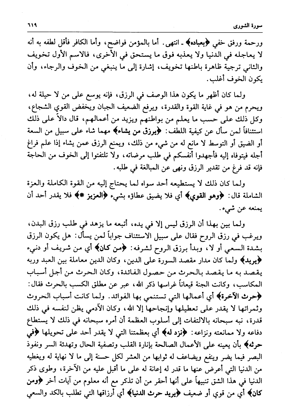 ولما بين بهذا أن الرزق ليس إلا في يده ، أتبعه ما يزهد في طلب رزق البدن ، ويرغب في رزق الروح فقال على سبيل الاستئناف جواباً لمن يسأل : هل يكون الرزق بشدة السعي أولاً ، وبدأ برزق الروح لشرفه : ( من كان ) أي من شريف أو دنيء ) يريد ( ولما كان مدار مقصد السورة على الدين ، وكان الدين معاملة بين العبد وربه يقصد به ما يقصد بالحرث من حصول الفائدة ، وكان الحرث من أجل أسباب المكاسب ، وكانت الجنة قيعاناً غراسها ذكر الله ، عبر عن مطلق الكسب بالحرث فقال : ( حرث الآخرة ) أي أعمالها وإنجاحها إلا الله ، وكان الآدمي يظن لنفسه في ذلك قدرة ، نبه سبحانه بالالتفات إلى أسلوب العظمة أن أمره سبحانه في ذلك لا يستطاع دفاعه ولا ممانعته ونزاعه : ( نزد له ) أي بعظمتنا التي لا يقدر أحد على تحويلها ) في حرثه ( بأن يعينه على الأعمال الصالحة بإنارة القلب وتصفية الحال وتهدئة السر ونفوذ البصر فيما يضر وينفع ويضاعف له ثوابها من العشر لكل حسنة إلى ما لا نهاية له ويغطيه ، من الدنيا التي أعرض عنها ما قدر له إعانة له على ما أقبل عليه من الآخرة ، وطى ذكر الدنيا في هذا الشق تنبيهاً على أنها أحقر من أن تذكر مع أنه معلوم من آيات أخر ) ومن كان ) أي من قوي أو ضعيف ) يريد حرث الدنيا ) أي أرزاقها التي تطلب بالكد والسعي