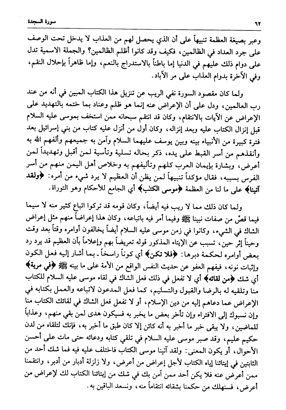 ولما كان ذلك مما لا ريب فيه أيضاً ، وكان قومه قدرتركوا كثير منه لا سيما فيما قصَّ من صفات نبينا ( صلى الله عليه وسلم ) وفيما أمر فيه باتباعه ، وكان هذا إعراضاً منهم مثل إعراض الشاك في الشيء ، وكانوا في زمن موسى عليه السلام أيضاً يخالفون أوامره وقتاً بعد وقت وحيناً إثر حين ، تسبب عن الإيتاء المذكور قوله تعريضاً بهم وإعلاماً بأن العظيم قد يرد رد بعض أوامره لحكمة دبرها : ( فلا تكن ) أي كوناً راسخاً - بما أشار إليه فعل الكون وإثبات نونه ، فيفهم العفو عن حديث النفس الواقع عن الأمة على ما بينه ( صلى الله عليه وسلم ) للكتاب منا وتلقيه له بالرضا والقبول والتسليم ، كما فعل المدعون لاتباعه والعمل بكتابه في الإعراض عما دعاهم إليه من دين الإسلام ، أو لا نفعل فعل الشاك في لقائك الكتاب منا وإن نسبوك إلى الإفتراء زإن تأخر بعض ما يخبر به فيسكون هدى لمن بقي منهم ، وعذاباً للماضين ، ولا يبقى خبر ما أخبر به أنه كائن إلا كان طبق ما أخبر به ، فإنك لتلقاه من لدن حكيم عليم ، وقد صبر موسى عليه السلام في تلقي كتابه ودعائه حتى مات على أحسن الأحوال ، أو يكون المعنى : ولقد آتينا موسى الكتاب فاختلف عليه فيه فما شك أحد من الثابتين في إيتائنا إياه الكتاب لأجل إعراض من أعرض ، ولا زلزلة أدبار من أدبر ، وانتقمنا ممن أعرض عنه فلا يكن أحد ممن آمن بك في شك من إيتائنا الكتاب لك لإعراض من أعرض ، فسنهلك من حكمنا بشقائه انتقاماً منه ، ونسعد الباقين به .