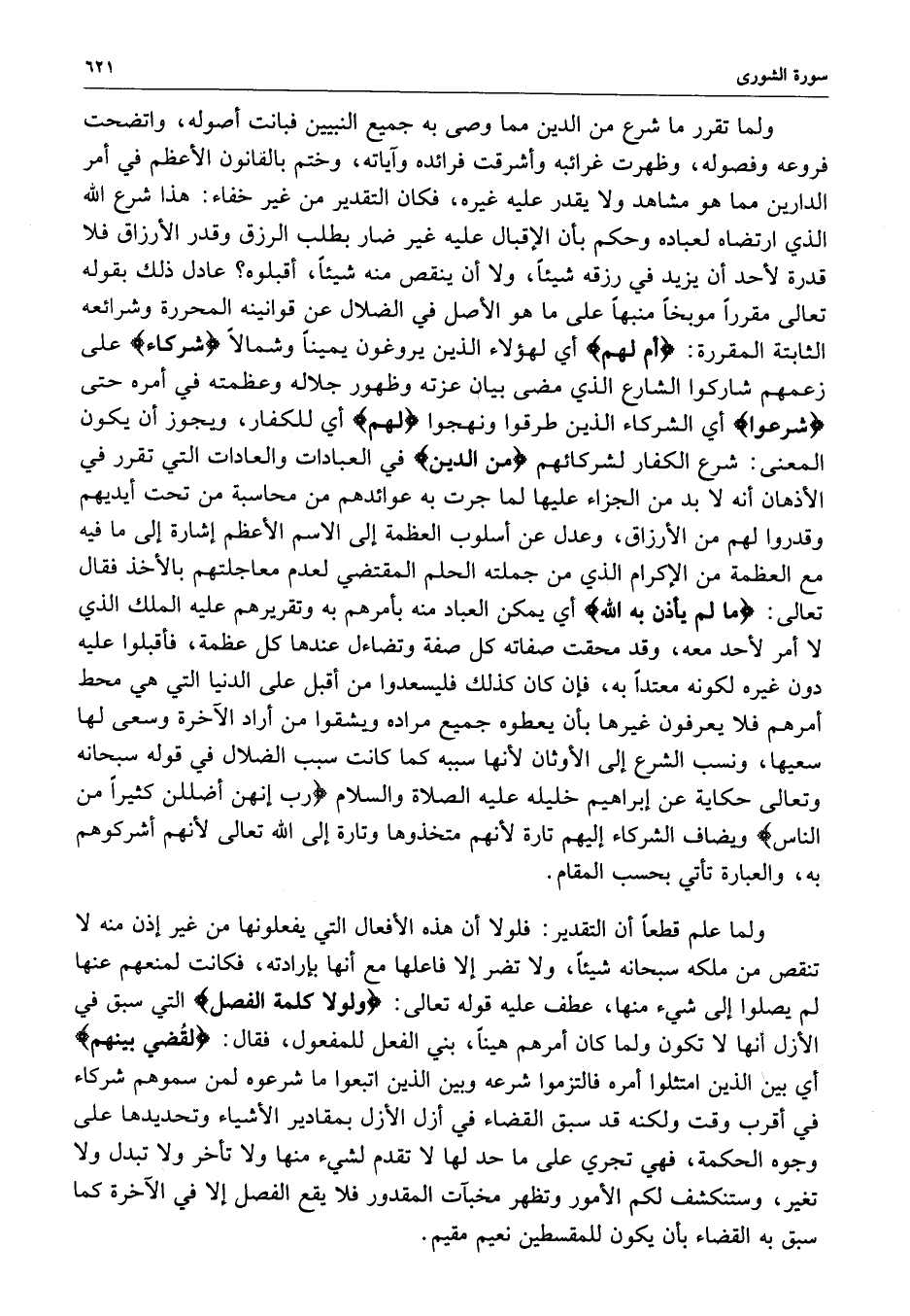 ولما علم قطعاً أن التقدير : فلولا أن هذه الأفعال التي يفعلونها من غير إذن منه لا تنقص من ملكه سبحانه شيئاً ، ولا تضر إلا فاعلها مع إنها بإرادته ، فكانت لمنعهم عنها لم يصلوا إلى شيء منها ، عطف عليه قوله تعالى : ( ولولا كلمة الفصل ( التي سبق في الأزل أنها لا تكون ولما كان أمرهم هيناً ، بني الفعل للمفعول ، فقال : ( لقُضي بينهم ) أي بين الذين امتثلوا أمره فالتزموا شرعه وبين الذين اتبعوا ما شرعوه لمن سموهم شركاء في أقرب وقت ولكنه قد سبق القضاء في أزل الأزل بمقادير الأشياء وتحديدها على وجوه الحكمة ، فهي تجري على حد لها ولا تقدم لشيء منها ولا تأخر ولا تبدل ولا تغير ، وستنكشف لكم الأمور وتظهر مخبآت المقدور فلا يقع الفصل إلا في الآخرة كما سبق به القضاء بأن يكون للمقسطين نعيم مقيم .