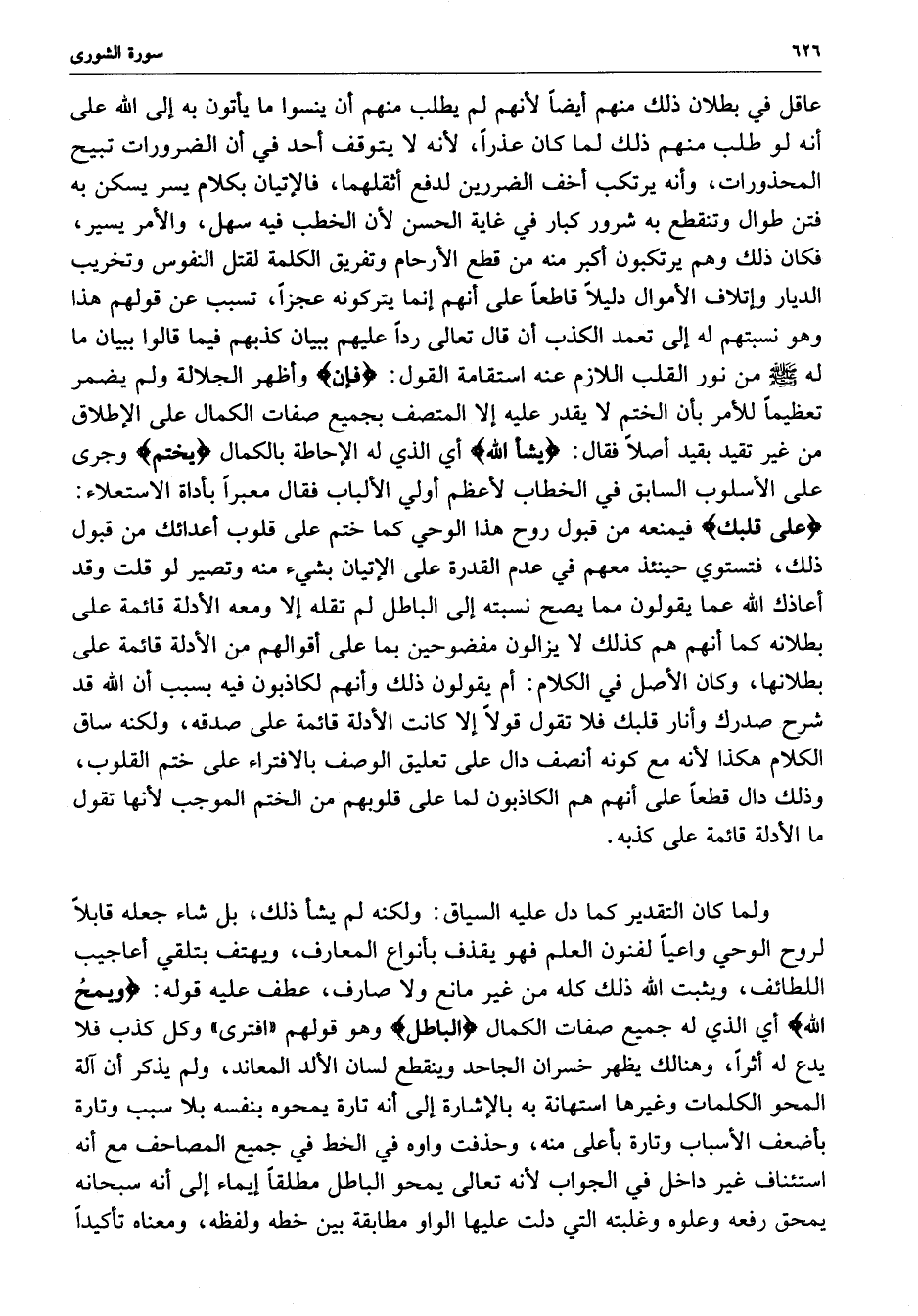عاقل في بطلان منهم أيضاً منهم أن ينسوا ما يأتون به إلى اله على أنه لو طلب منهم ذلك لما كان عذراً ، لأنه لا يتوقف أحد في أن الضرورات تبيح المحذورات ، وأنه يرتكب أخف الضررين لدفع أثقلهما ، فالإيتان بكلام يسر يسكن به فتن طوال وتنقطع به شرور كبار في غاية الحسن لأن الخطب فيه سهل ، والأمر يسير ، فكان ذلك وهم يرتكبون أكبر منه من قطع الأرحام وتفريق الكلمة لقتل النفوس وتخريب الديار وإتلاف الأموال دليلاً قاطعاً على أنهم إنما يتركونه عجزاً ، تسبب عن قولهم هذا وهو نسبتهم له إلى تعمد الكذب أن قال تعالى رداً عليهم ببيان كذبهم فيما قالوا ببيان ما له ( صلى الله عليه وسلم ) من نور القلب اللازم عن استقامة القول : ( فإن ( وأظهر الجلالة ولم يضمر تعظيماً للأمر بأن الختم لا يقدر عليه إلا المتصف بجميع صفات الكمال على الإطلاق من غير تقيد أصلاً فقال : ( يشأ الله ) أي الذي له الإحاطة بالكمال ) يختم ( وجرى على الأسلوب السابق في الخطاب لأعظم أولي الألباب فقال معبراً بأداة الاستعلاء : ( على قلبك ( فيمنعه من قبول روح هذا الوحي كما ختم على قلوب أعدائك من قبول ذلك ، فتستوي حينئذ معهم في دعم القدرة على الإيتان بشيء منه وتصير لو قلت وقد أعاذك الله عما يقولون مما يصح نسبته إلى الباطل لم تقله إلا ومعه الأدلة قائمة على بطلانها ، وكان الأصل في الكلام : أم يقولون ذلك وأنهم لكاذبون فيه بسبب أن الله قد شرح صدرك وأنار قلبك فلا تقول فولاً إلا كانت الأدلة قائمة على صدقه ، ولكنه ساق الكلام هكذا لأنه مع كونه أنصف دال على تعليق بالافتراء على ختم القلوب ، وذلك دالاً قطعاً على أنهم هم الكاذبون لما على قلوبهم من الختم الموجب لأنها تقول ما الأدلة قائمة على كذبه .
