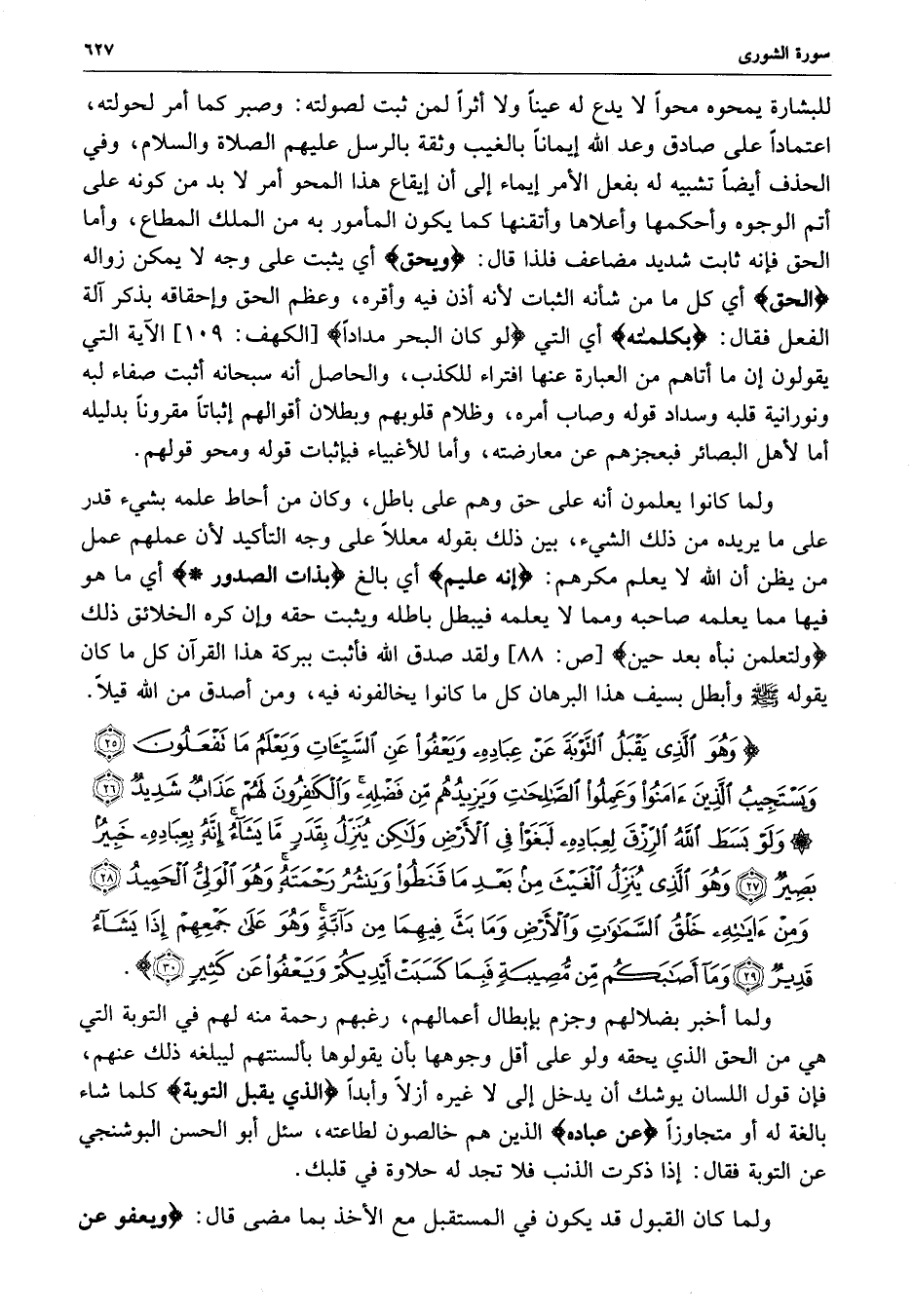 ) وَهُوَ الَّذِي يَقْبَلُ التَّوْبَةَ عَنْ عِبَادِهِ وَيَعْفُواْ عَنِ السَّيِّئَاتِ وَيَعْلَمُ مَا تَفْعَلُونَ وَيَسْتَجِيبُ الَّذِينَ آمَنُواْ وَعَمِلُواْ الصَّالِحَاتِ وَيَزِيدُهُم مِّن فَضْلِهِ وَالْكَافِرُونَ لَهُمْ عَذَابٌ شَدِيدٌ وَلَوْ بَسَطَ اللَّهُ الرِّزْقَ لِعِبَادِهِ لَبَغَوْاْ فِي الأَرْضِ وَلَكِن يُنَزِّلُ بِقَدَرٍ مَّا يَشَآءُ إِنَّهُ بِعِبَادِهِ خَبِيرُ بَصِيرٌ وَهُوَ الَّذِي يُنَزِّلُ الْغَيْثَ مِن بَعْدِ مَا قَنَطُواْ وَيَنشُرُ رَحْمَتَهُ وَهُوَ الْوَلِيُّ الْحَمِيدُ وَمِنْ آيَاتِهِ خَلْقُ السَّمَاوَاتِ وَالأَرْضِ وَمَا بَثَّ فِيهِمَا مِن دَآبَّةٍ وَهُوَ عَلَى جَمْعِهِمْ إِذَا يَشَآءُ قَدِيرٌ وَمَآ أَصَابَكُمْ مِّن مُّصِيبَةٍ فَبِمَا كَسَبَتْ أَيْدِيكُمْ وَيَعْفُواْ عَن كَثِيرٍ ( ( )
